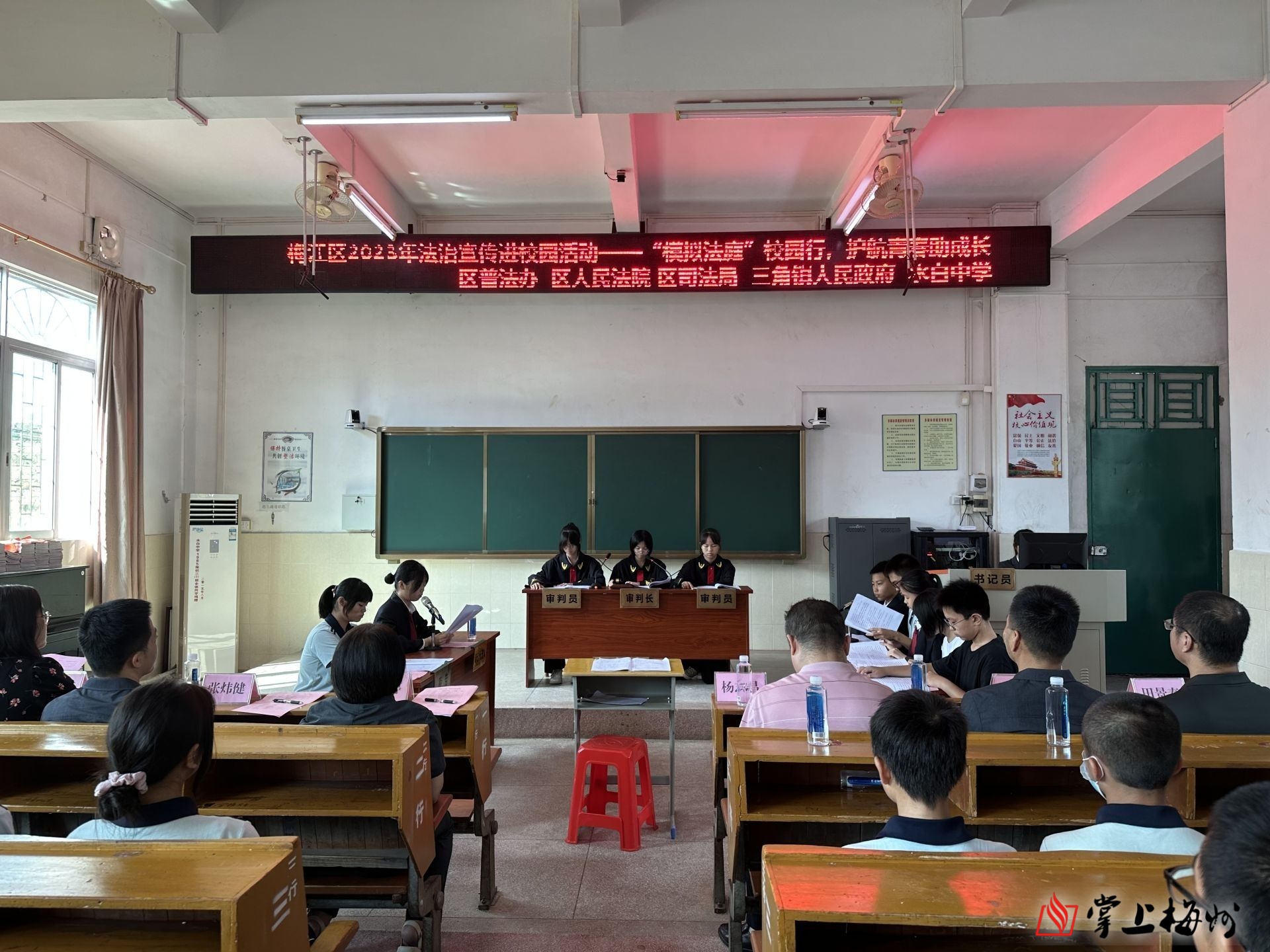 掌上梅州讯 20日上午,“模拟法庭校园行,护航青春助成长”活动走进梅江区水白中学,给师生们上了一堂生动直观的法治教育实践课,学校老师和学生代表共100余人参加。