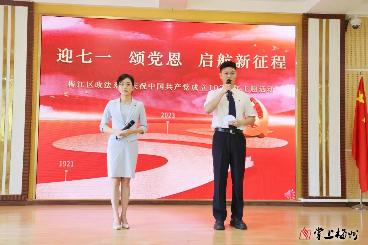 活动中,区政法系统党委书记古炜霖带领全体党员同志面向党旗重温入党誓词。随后,举行了情景党课——党员政治生日,系统党委副书记刘琼为7月份入党的党员提前送上了政治生日贺卡和真诚祝福。活动还通过诗歌朗诵、讲述梅江政法好故事、党务知识竞答、古筝独奏、书法展示、歌曲演唱等精彩纷呈的节目,展现出新时代梅江政法队伍实干笃行、竞标争先、昂扬向上的精神风貌。