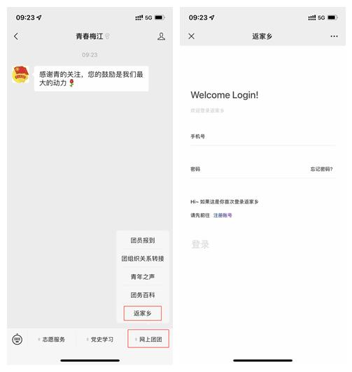 第二步,在菜单栏选择“网上团团”-“返家乡”栏目。首次登陆用户需按提示注册账号并返回登录,已注册的学生或有高校第二课堂成绩单系统账号的学生可直接登录。