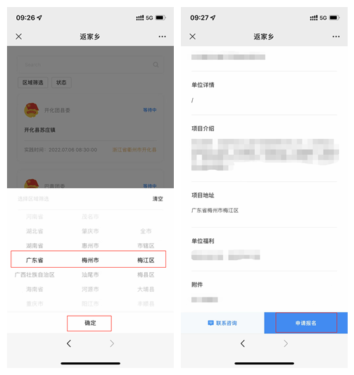 第四步,选择“广东省-梅州市-梅江区”-“确定”,浏览单位发布的项目信息,以及项目信息详情,选择心仪的项目“申请报名”。