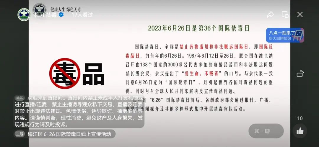 6月25日19时,梅江公安举办梅江区“6·26”国际禁毒日线上禁毒宣传活动,积极探索运用新媒体、新方式宣传禁毒知识,通过“梅江禁毒”微信视频号直播讲解传统毒品和新型毒品种类,毒品的危害和预防措施等。