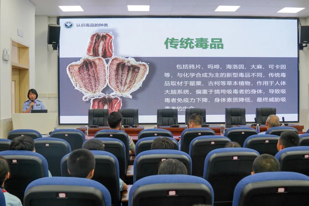 民警以虎门销烟的历史故事为背景,向在校师生讲解禁毒历史、禁毒相关法律法规、毒品种类及危害等,进一步增强青少年禁毒意识,让青少年更加清醒地认识到识毒、防毒、拒毒的必要性,为构建绿色无毒校园环境奠定良好基础。
