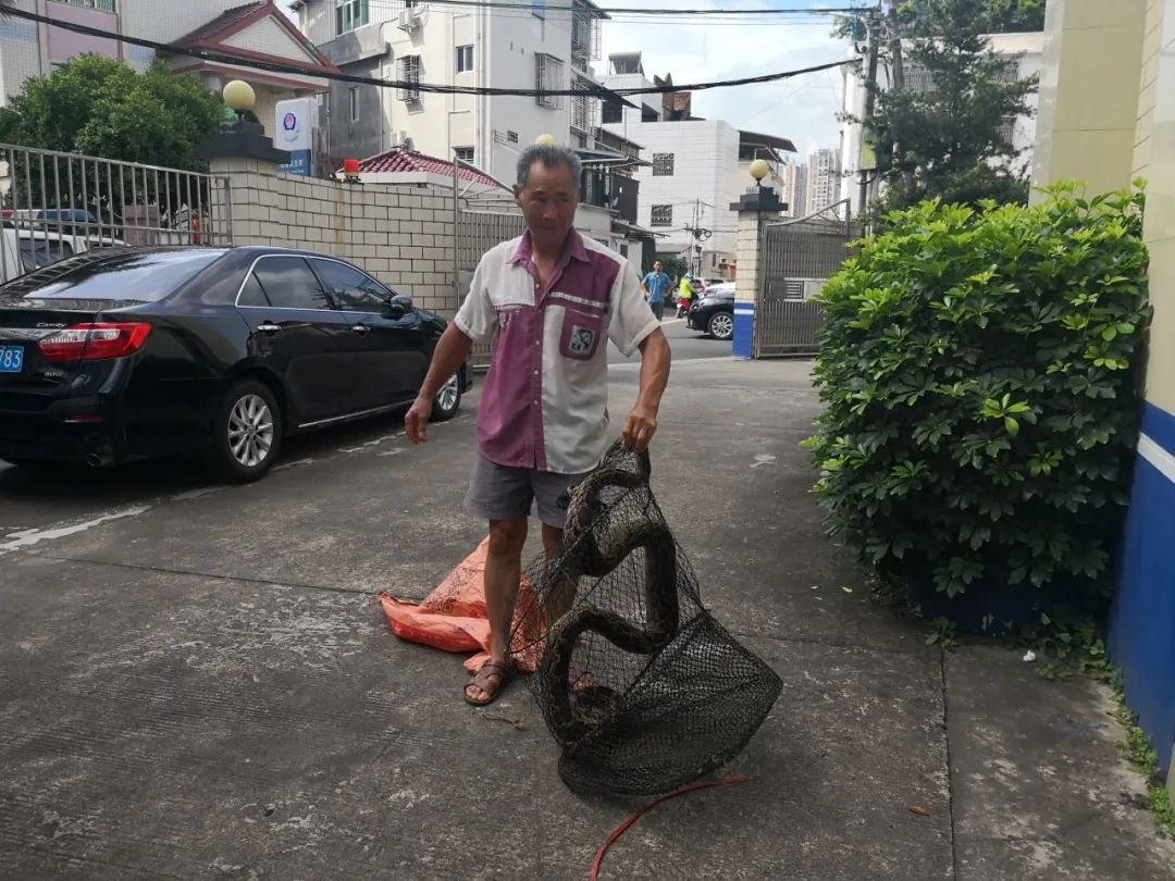 话音刚落,周叔便将网袋小心翼翼地放在派出所门口的地板上。民警上前一看,竟是一条大蛇,由于不清楚该蛇的品种及其是否具有毒性,民警将周边围观群众迅速疏散,随后第一时间通知森林大队民警和专业捕蛇师傅到场处置。