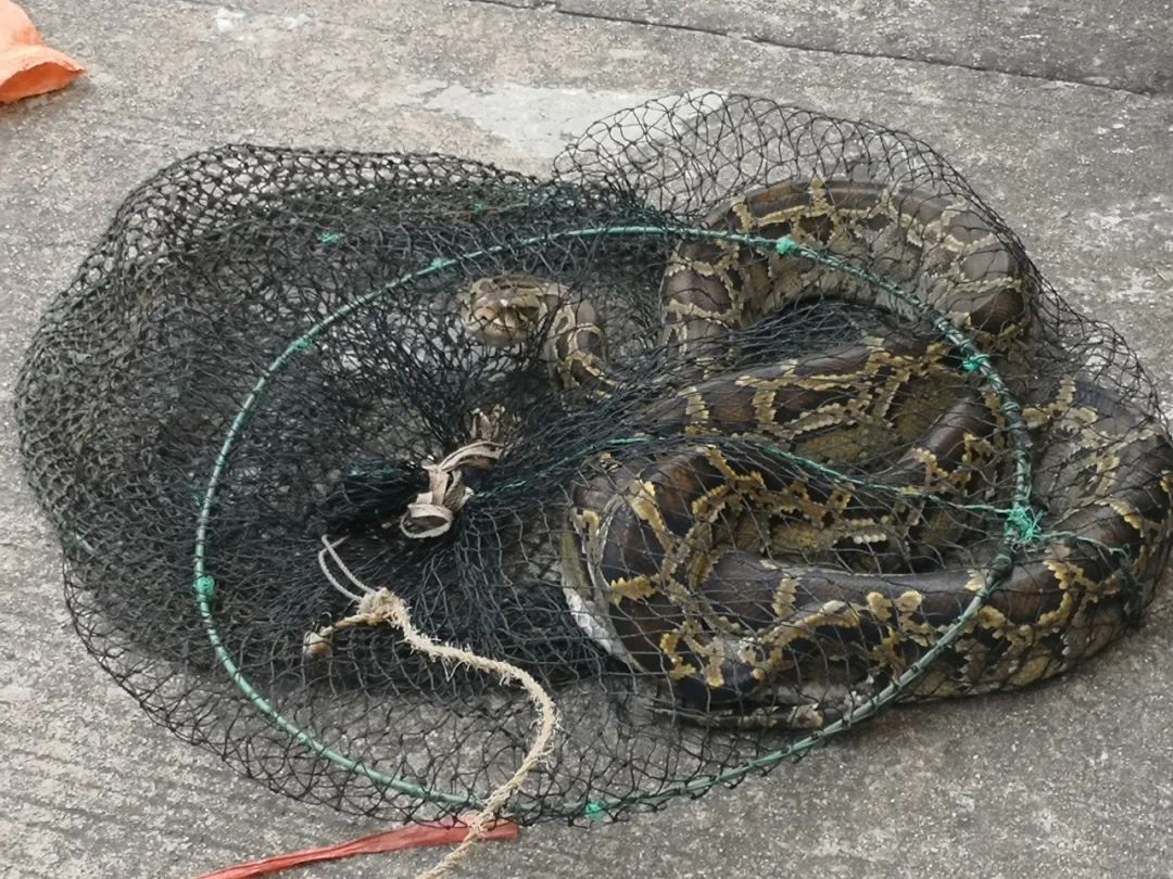 专业捕蛇师傅到达现场后,将蛇从渔网中取出,并小心翼翼地装入提前准备好的网袋中。经辨认,周叔捕获的蛇为蟒蛇,长约2.8米,重约30斤。目前,该蛇已由森林大队民警带至人烟稀少的野外放生,让其回归大自然。