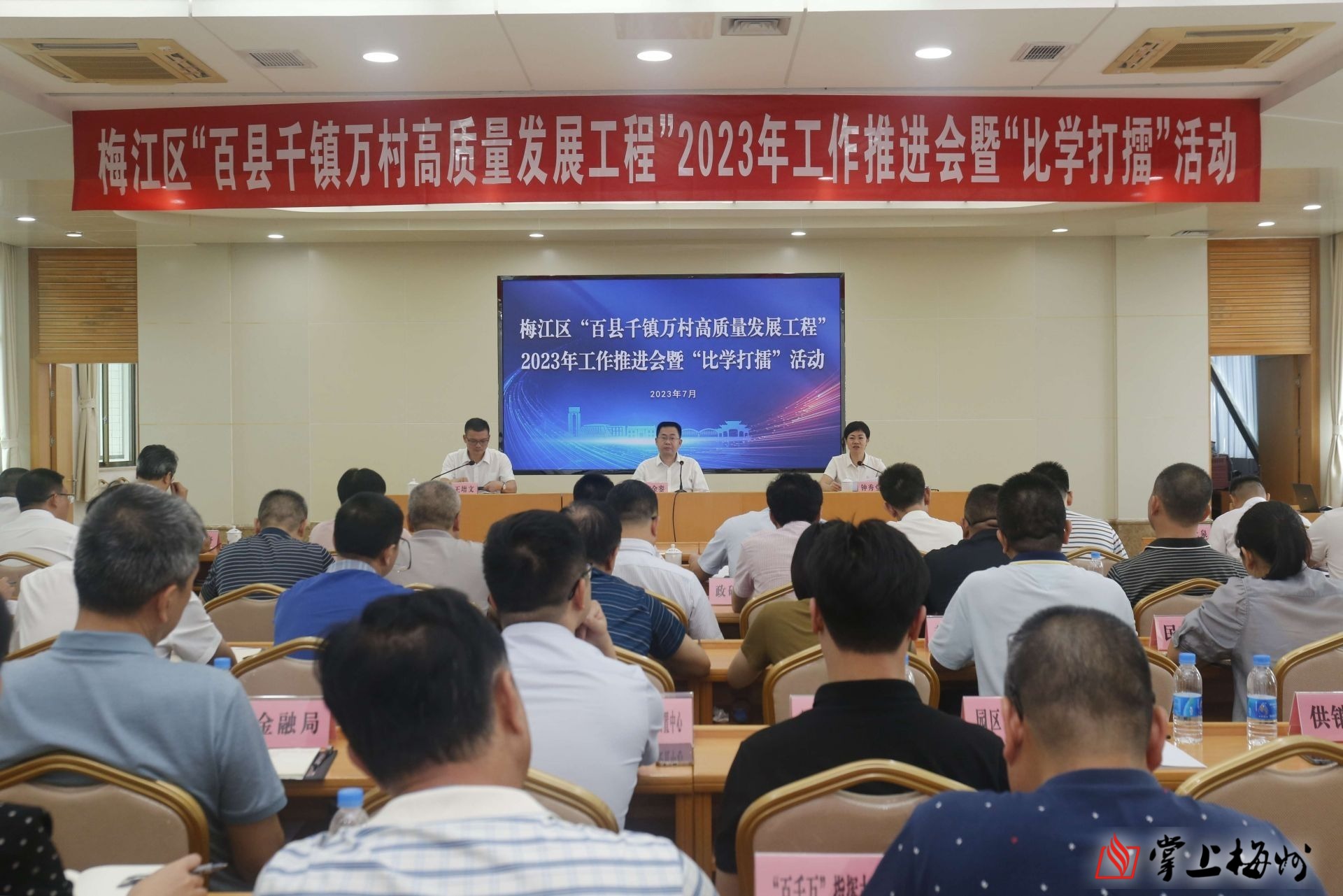 掌上梅州讯 7月20日,梅江区举行“百千万工程”2023 年工作推进会暨“比学打擂”活动,通过实地观摩、演示汇报、领导点评等方式,展示成绩、提振信心,查找不足、补齐短板,进一步掀起“百千万工程”建设热潮。市委常委、副市长,梅江区委书记陈金銮,区长钟秀堂,区委副书记、政法委书记王增文等参加活动。