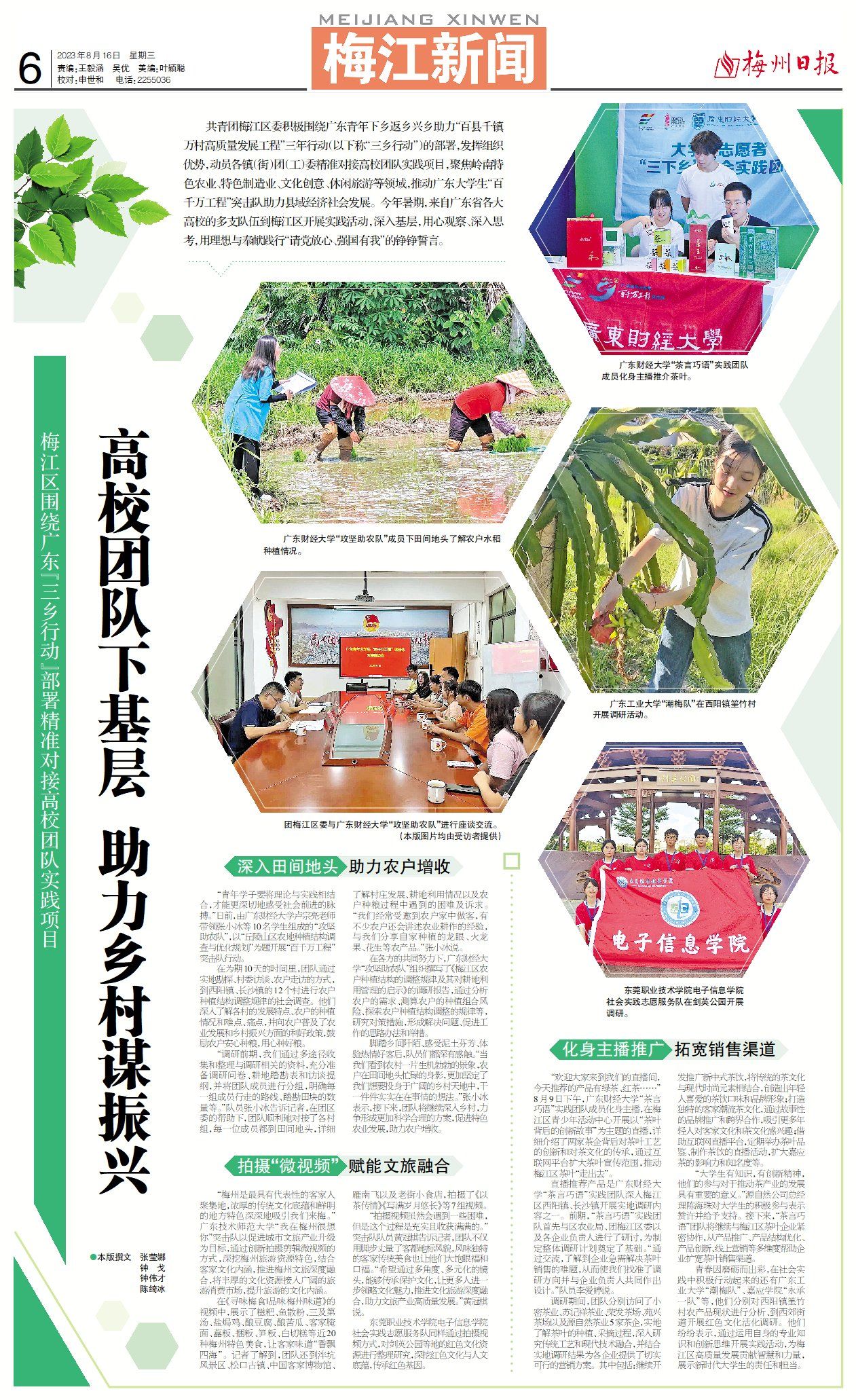 共青团梅江区委积极围绕广东青年下乡返乡兴乡助力“百县千镇万村高质量发展工程”三年行动(以下称“三乡行动”)的部署,发挥组织优势,动员各镇(街)团(工)委精准对接高校团队实践项目,聚焦岭南特色农业、特色制造业、文化创意、休闲旅游等领域,推动广东大学生“百千万工程”突击队助力县域经济社会发展。今年暑期,来自广东省各大高校的多支队伍到梅江区开展实践活动,深入基层,用心观察、深入思考,用理想与奉献践行“请党放心、强国有我”的铮铮誓言。