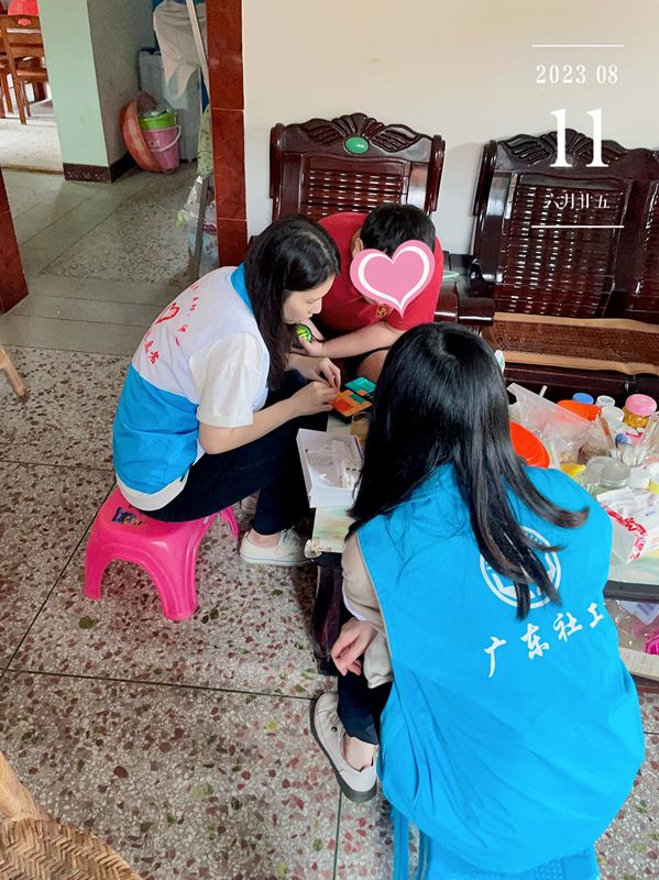 社工为小锋(化名)赠送荣华道智力玩具和手部力量锻炼球,增强智力锻炼和手部力量训练。