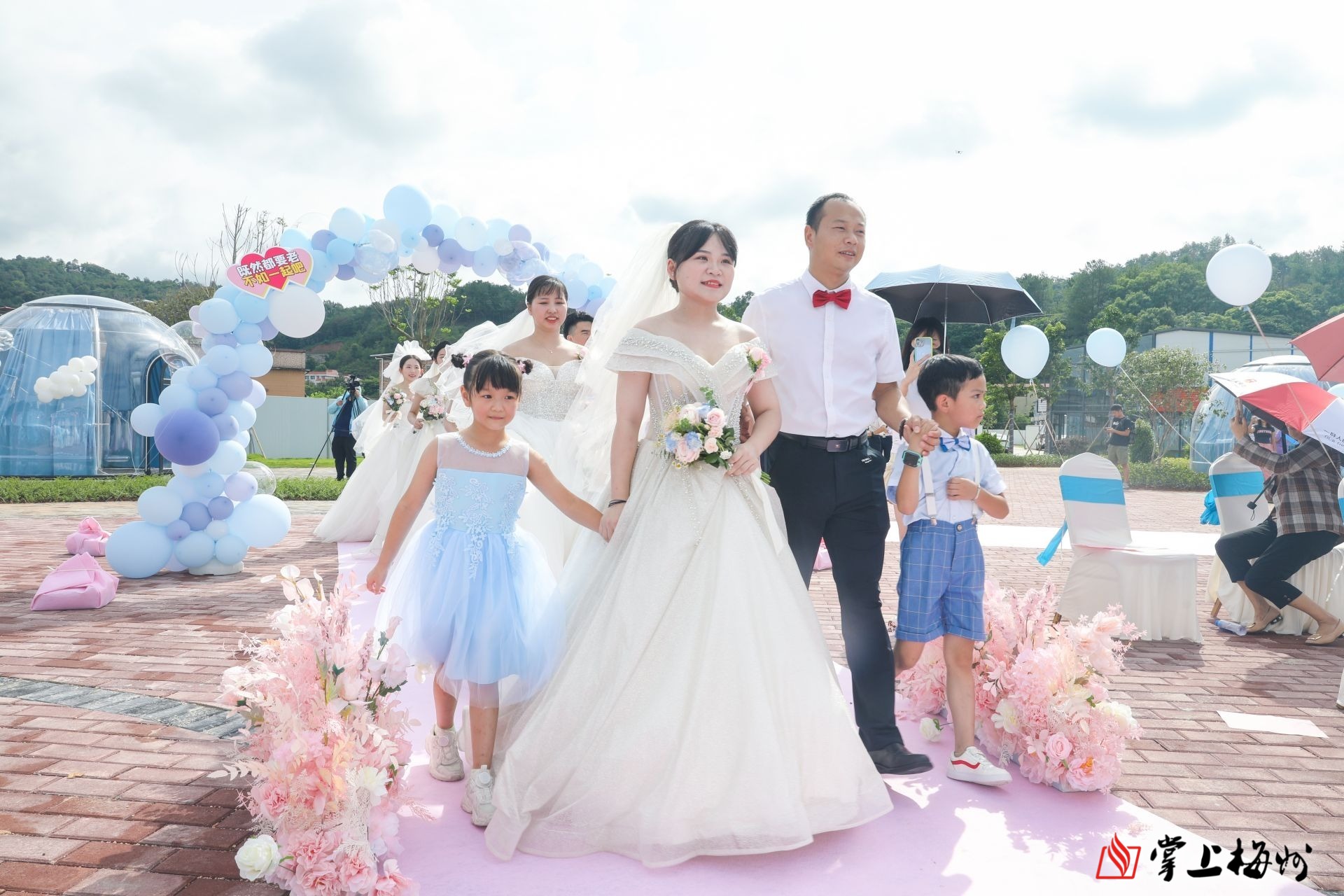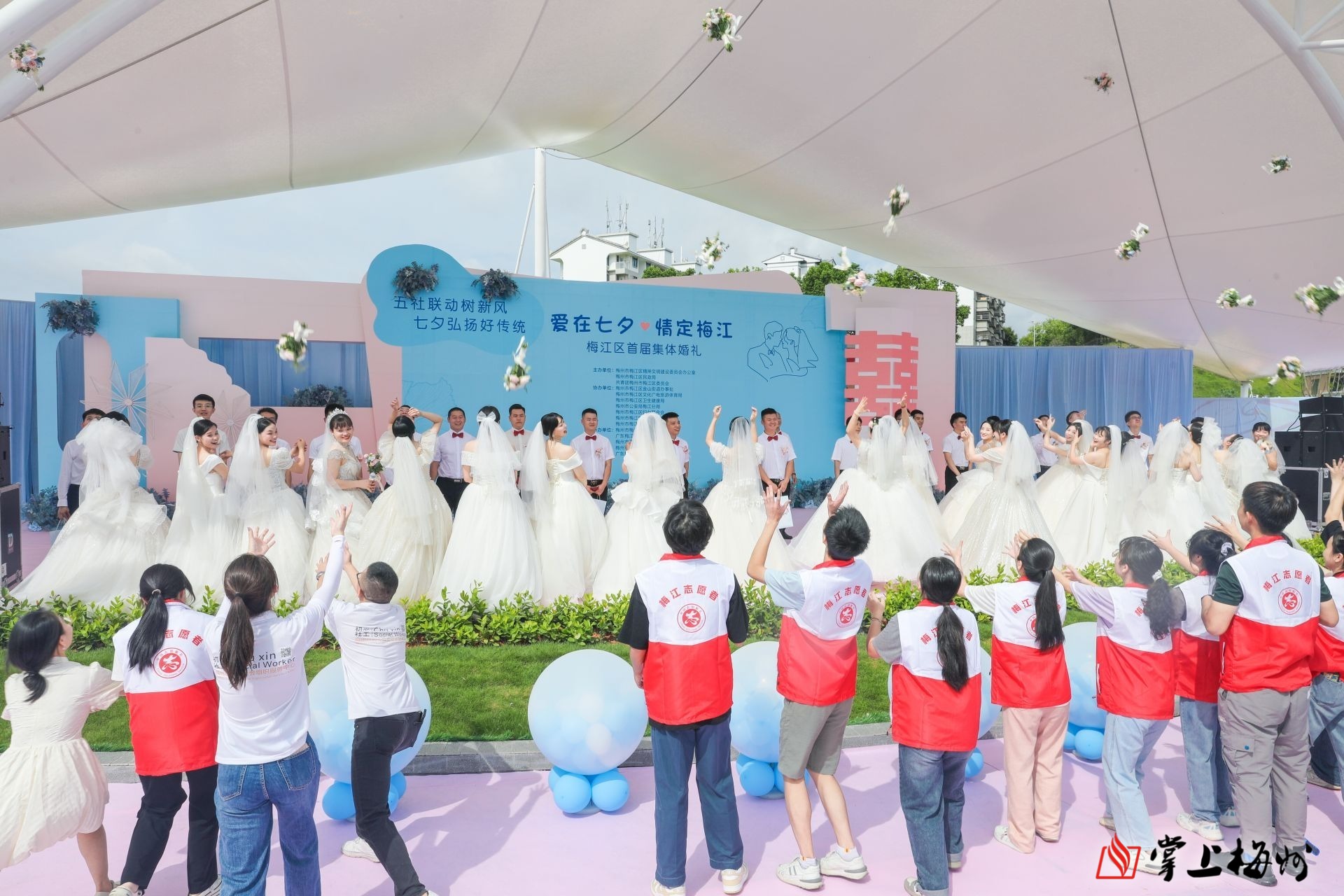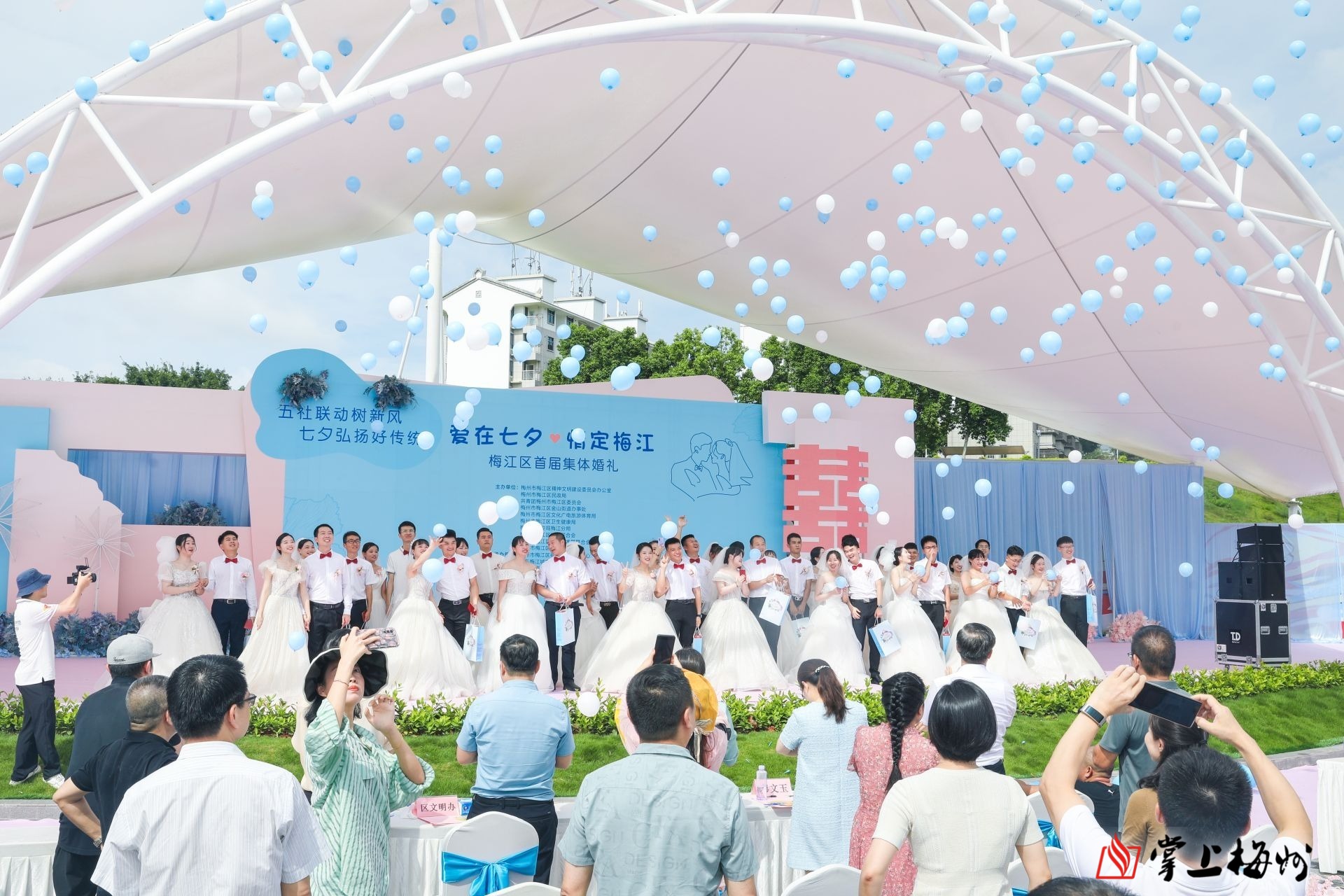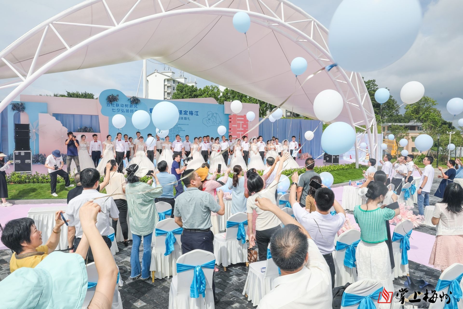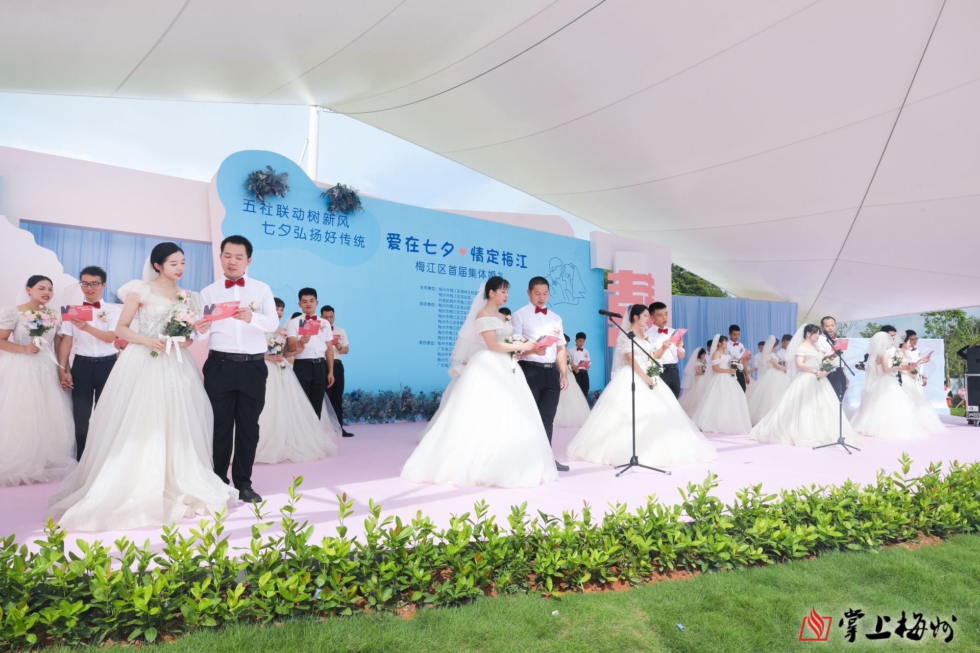 掌上梅州讯 8 月 22 日上午,梅江区在青梅互联网创业产业园举办“五社联动树新风,七夕弘扬好传统——爱在七夕,情定梅江”首届集体婚礼活动,20对新人共同举办婚礼。