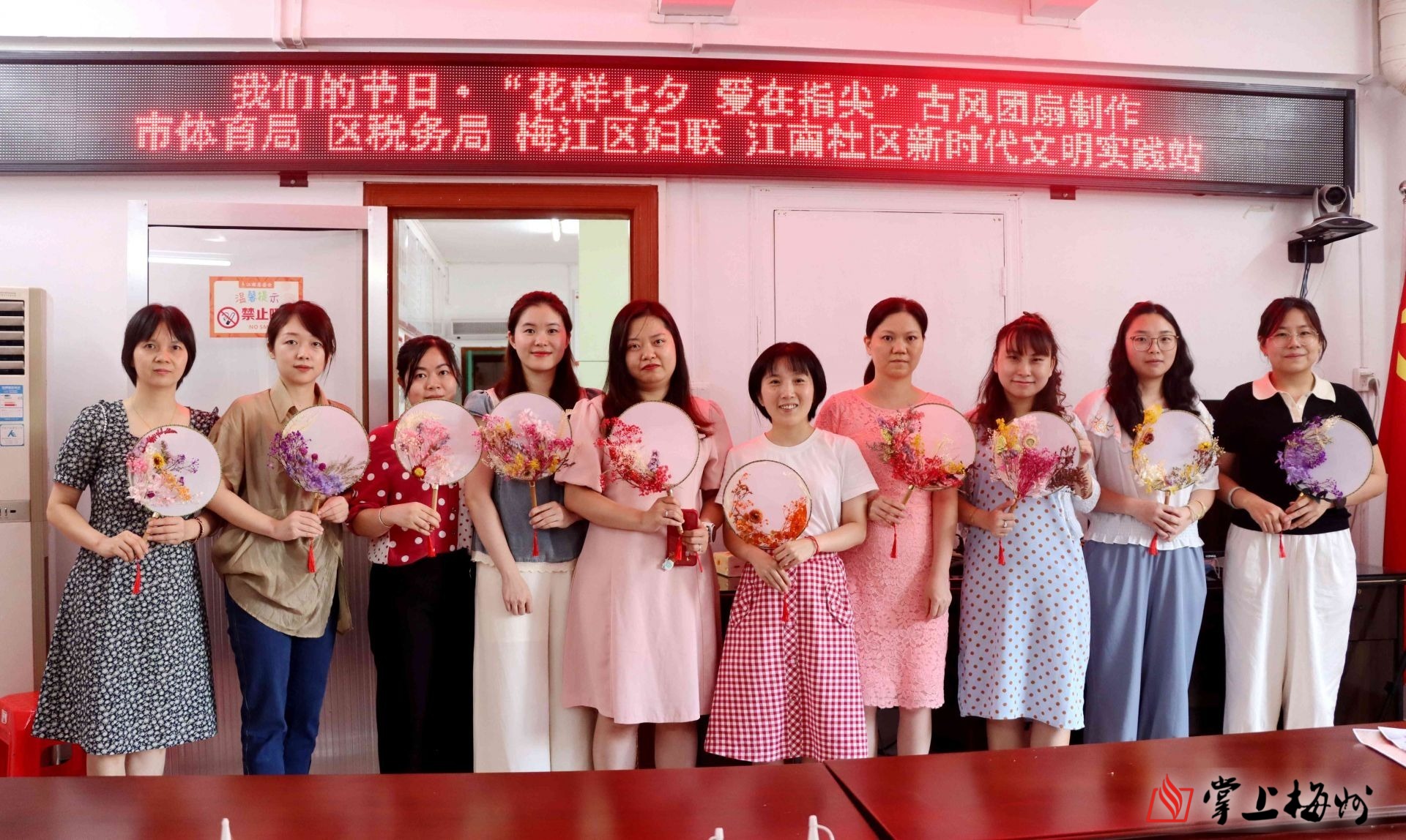 七夕节又称乞巧节、女儿节,是我国传统节日中最具浪漫色彩的节日。8月22日下午,梅江区江南街道江南社区组织开展我们的节日·“花样七夕 爱在指尖”古风团扇制作活动,让大家通过亲手制作精美团扇,领略传统文化的魅力。活动由江南社区联合市体育局、区税务局、江南社区新时代文明实践站举办,来自相关单位的女同胞积极参与了该活动。