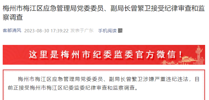 梅州市梅江区应急管理局党委委员、副局长曾繁卫涉嫌严重违纪违法,目前正接受梅州市梅江区纪委监委纪律审查和监察调查。