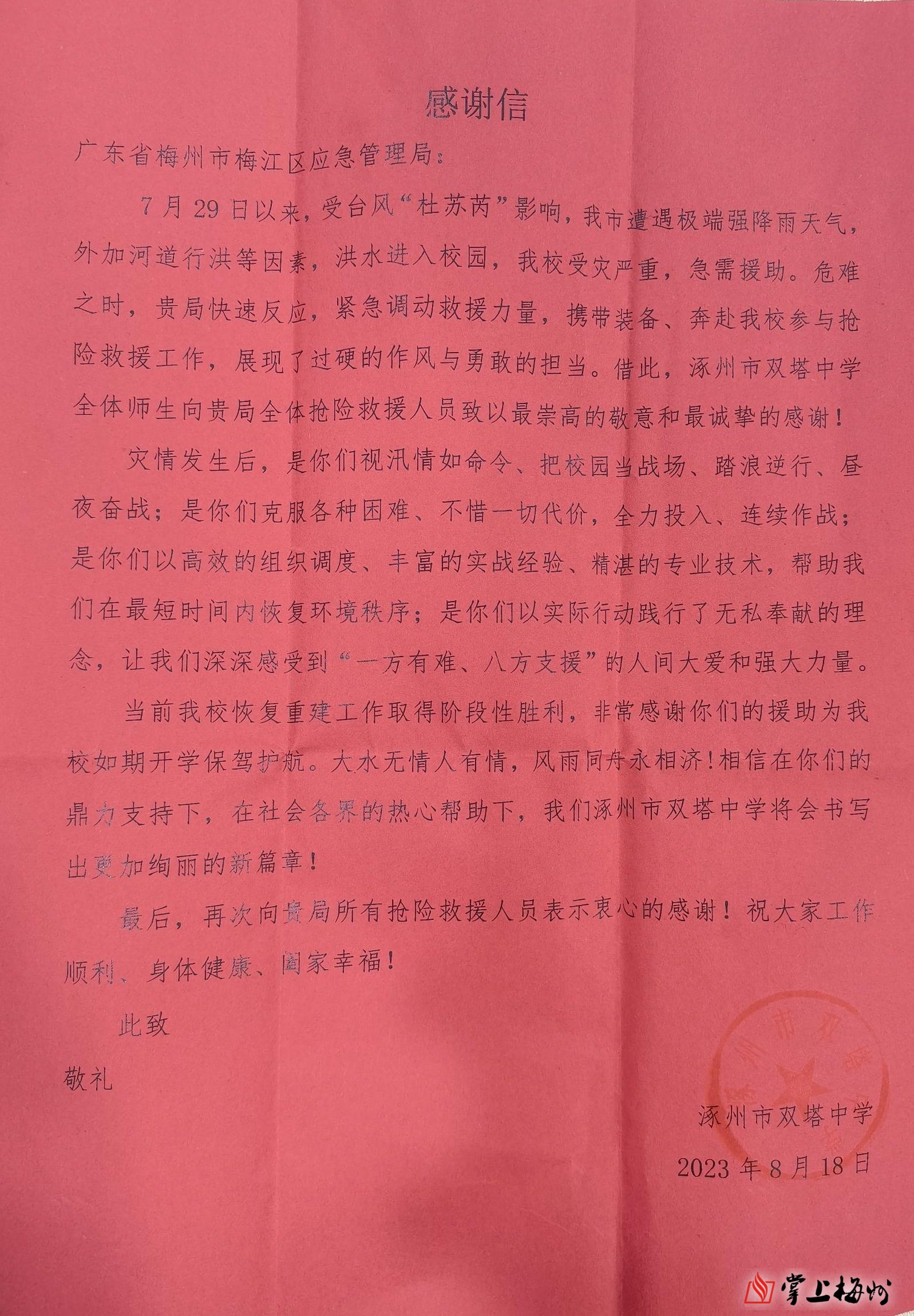 “危难之时,贵局快速反应,紧急调动救援力量,携带装备、奔赴我校参与抢险救援工作。借此,涿州市双塔中学全体师生向贵局全体抢险救援人员致以最崇高的敬意和最诚挚的感谢!”近日,梅江区应急管理局收到了一封来自千里之外的河北省涿州市双塔中学的感谢信,随信而至的还有一面承载着该校师生和涿州群众沉甸甸感恩情的锦旗。
