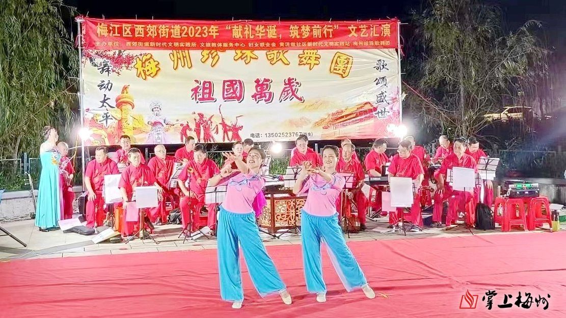 此次活动特别邀请了当地的艺术团队“梅州珍珠歌舞团”进行表演,包括舞蹈、歌曲、汉乐表演等,为居民们带来了一场视觉盛宴。现场不仅有经典歌曲《老家的月光母亲的目光》《月光光》《五星红旗》等,也有自创山歌《赞梅江望杏坊》,精彩的表演让在场的观众们跟着哼唱。此外,一些富有创意的舞蹈和民乐合奏节目,也赢得了观众们的阵阵掌声。