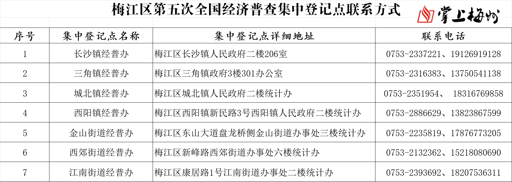 您好!为做好第五次全国经济普查单位清查查疑补漏工作,经梅江区第五次全国经济普查领导小组研究决定,于10月13日起在全区范围内开展集中清查登记工作。集中清查登记对象是第五次全国经济普查中尚未进行清查登记的从事第二、第三产业的企业(单位)和个体经营户。现就有关事项通告如下: