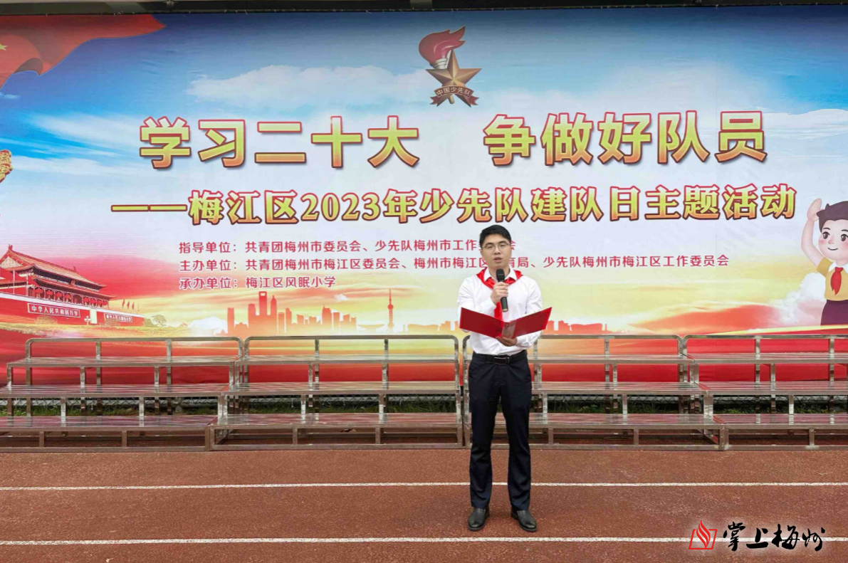 掌上梅州讯 10月13日上午,团区委、区教育局、区少工委联合在梅江区风眠小学开展“学习二十大•争做好队员”梅江区2023年少先队建队日主题活动。团市委副书记陈宁,梅江区委副书记、政法委书记王增文,团区委书记温宇杰,团市委学少部部长刘怡新,团区委及教育局相关负责同志,学校教师代表、少先队员参加活动。