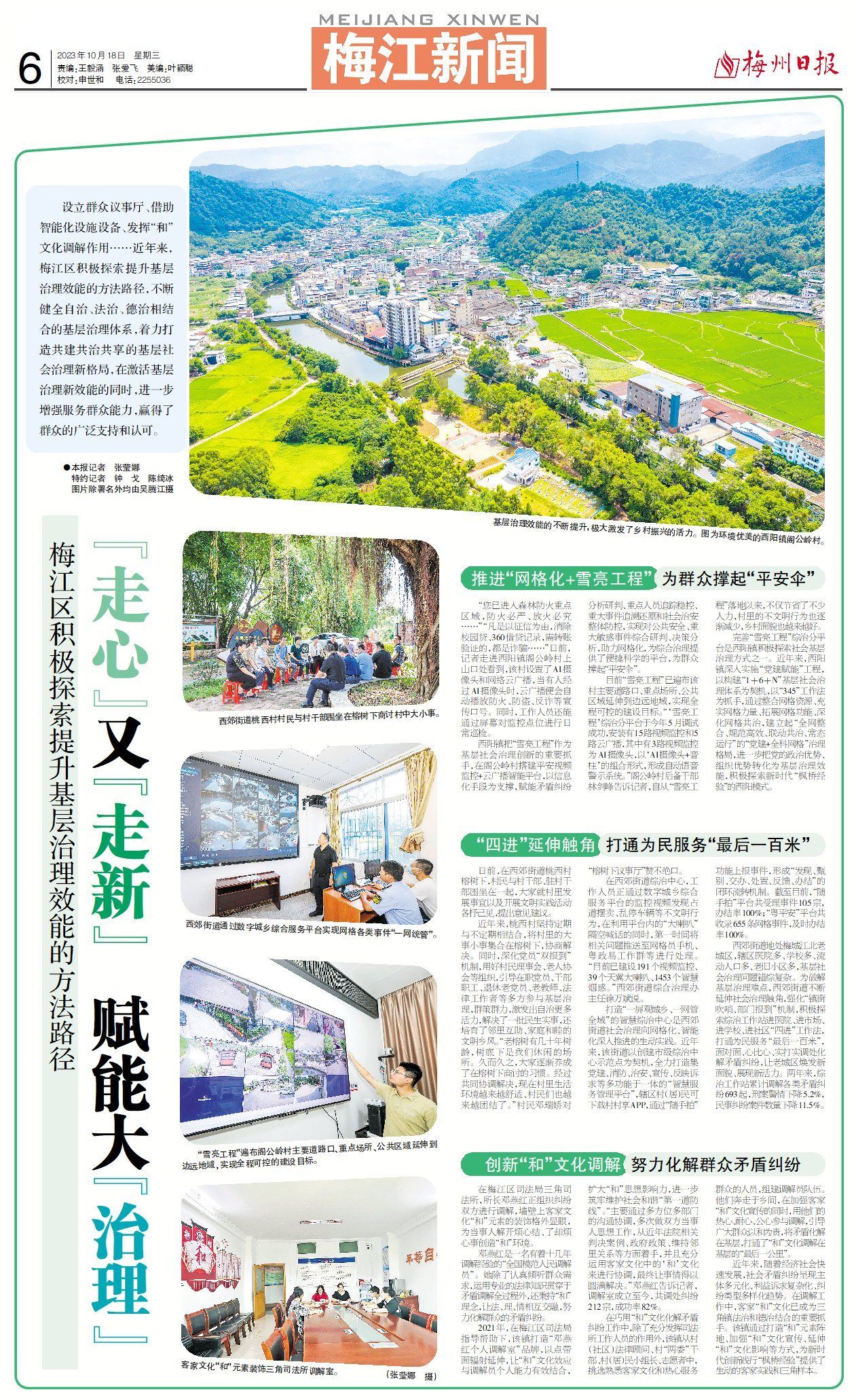 设立群众议事厅、借助智能化设施设备、发挥“和”文化调解作用……近年来,梅江区积极探索提升基层治理效能的方法路径,不断健全自治、法治、德治相结合的基层治理体系,着力打造共建共治共享的基层社会治理新格局,在激活基层治理新效能的同时,进一步增强服务群众能力,赢得了群众的广泛支持和认可。