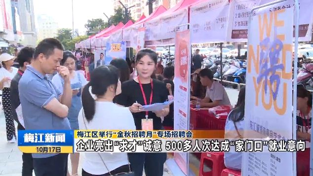 日前,梅江区“金秋招聘月”专场招聘会在万达广场举行,企业纷纷亮出“求才”诚意,活动现场共有56家企业提供了1200个岗位供求职者选择,初步达成就业意向约508人次。一起去看看。