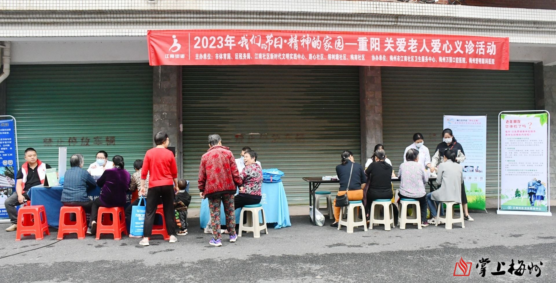掌上梅州讯 10月23日,农历九月初九,我们迎来传统节日重阳节。为大力弘扬中华民族“尊老、敬老、爱老、助老”的传统美德,让老年人朋友感受祥和、欢乐的节日氛围,梅江区江南街道江南社区联合市体育局、区税务局、路心社区、榕树塘社区、梅南社区,梅州市江南社区卫生服务中心、梅州万国口腔医院、梅州爱明眼科医院共同开展“我们的节日·精神的家园——重阳”关爱老人爱心义诊活动。