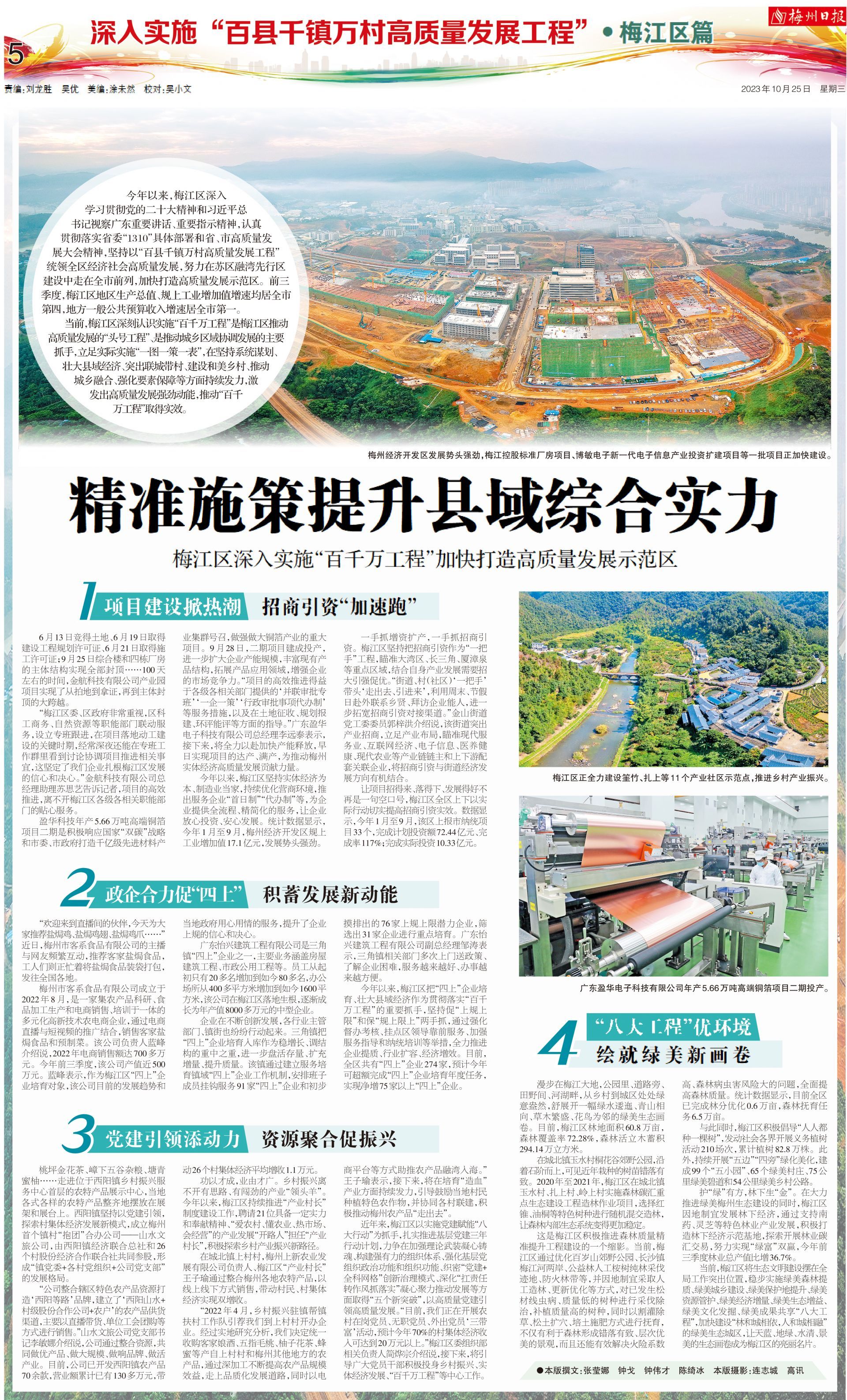 当前,梅江区深刻认识实施“百千万工程”是梅江区推动高质量发展的“头号工程”、是推动城乡区域协调发展的主要抓手,立足实际实施“一图一策一表”,在坚持系统谋划、壮大县域经济、突出联城带村、建设和美乡村、推动城乡融合、强化要素保障等方面持续发力,激发出高质量发展强劲动能,推动“百千万工程”取得实效。