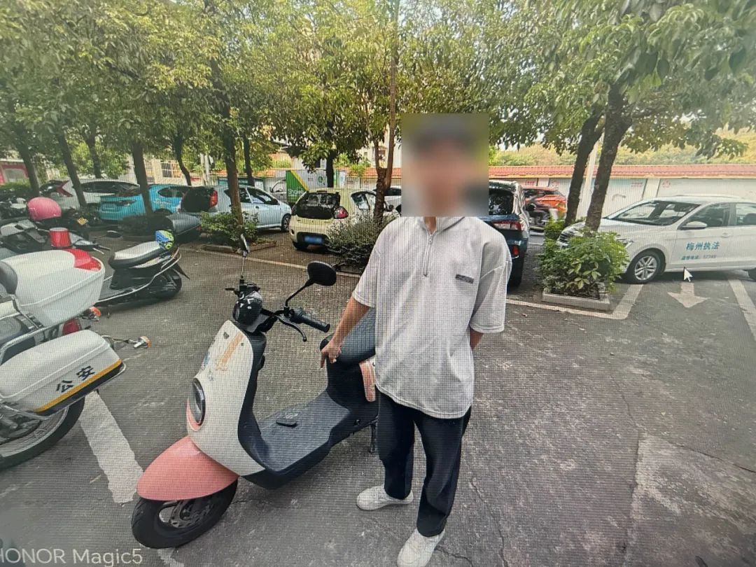 10月16日12时许,梅州市公安局梅江分局东郊派出所接到事主小潘报警,称其上午停放在书山路的电动摩托车“不翼而飞”,疑似遭人盗窃。接报后,办案民警第一时间赶赴现场展开勘查,并调取案发现场及周边的监控视频进行分析研判,发现一名身穿白色短袖上衣的年轻男子走到小潘的电动摩托车旁,将车上插着的钥匙偷偷顺走,等到11时30分再返回将车辆骑走。