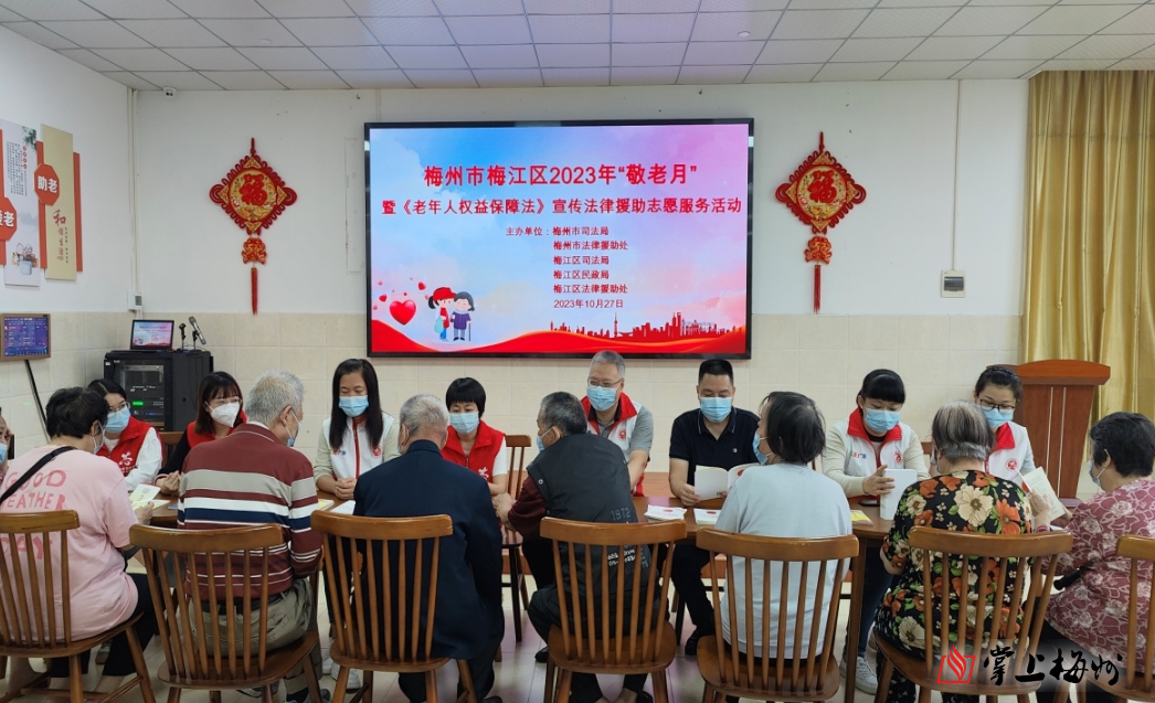 掌上梅州讯 10月27日,梅州市司法局、梅州市法律援助处、梅江区司法局、梅江区法律援助处联合梅江区民政局走进梅州市福利院开展“敬老月”暨《老年人权益保障法》宣传法律援助志愿服务活动。