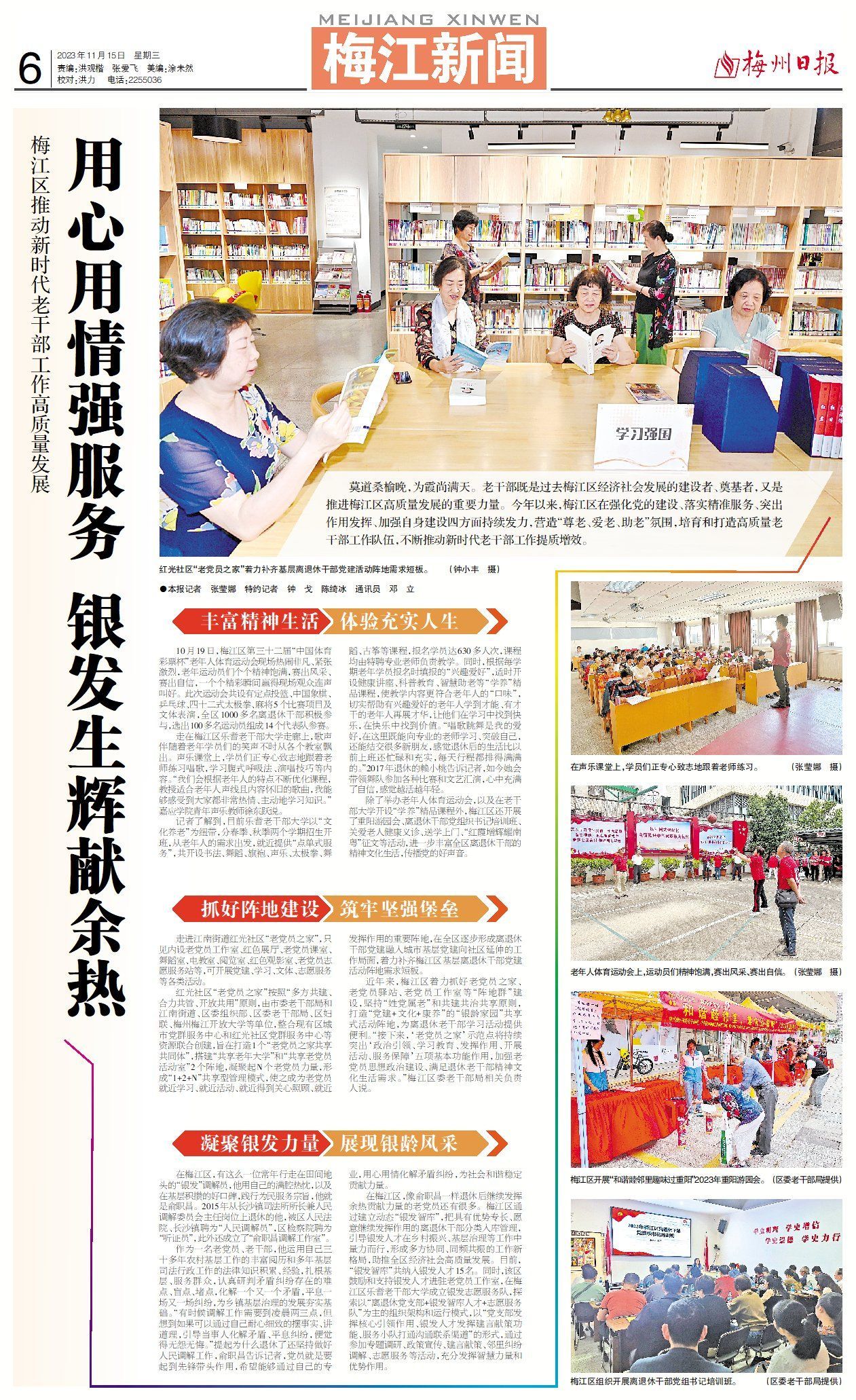除了举办老年人体育运动会,以及在老干部大学开设“学养”精品课程外,梅江区还开展了重阳游园会、离退休干部党组织书记培训班、关爱老人健康义诊、送学上门、“红霞增辉耀南粤”征文等活动,进一步丰富全区离退休干部的精神文化生活,传播党的好声音。