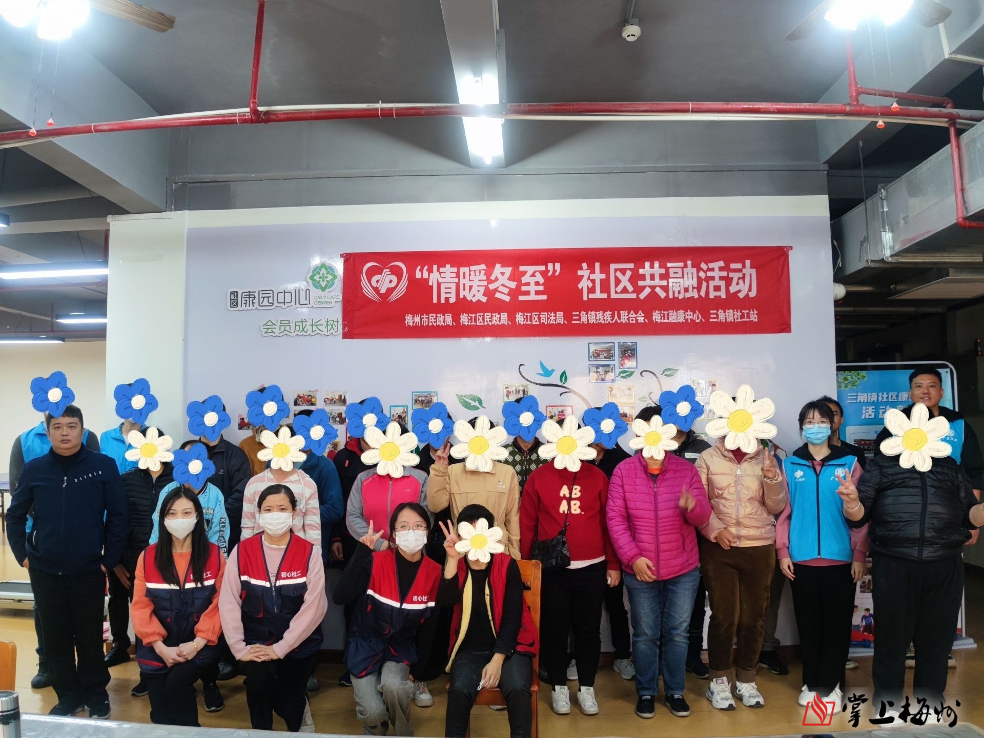掌上梅州讯 在12月3日国际残疾人日来临之际,12月1日,在梅州市民政局、梅江区民政局的指导下,梅江区融康中心联动梅江区司法局、三角镇残疾人联合会、三角镇社工站在三角镇居家养老服务中心举办“情暖冬至”社区共融活动,共有20名社区残疾人及家属、社区志愿者参与本次活动。