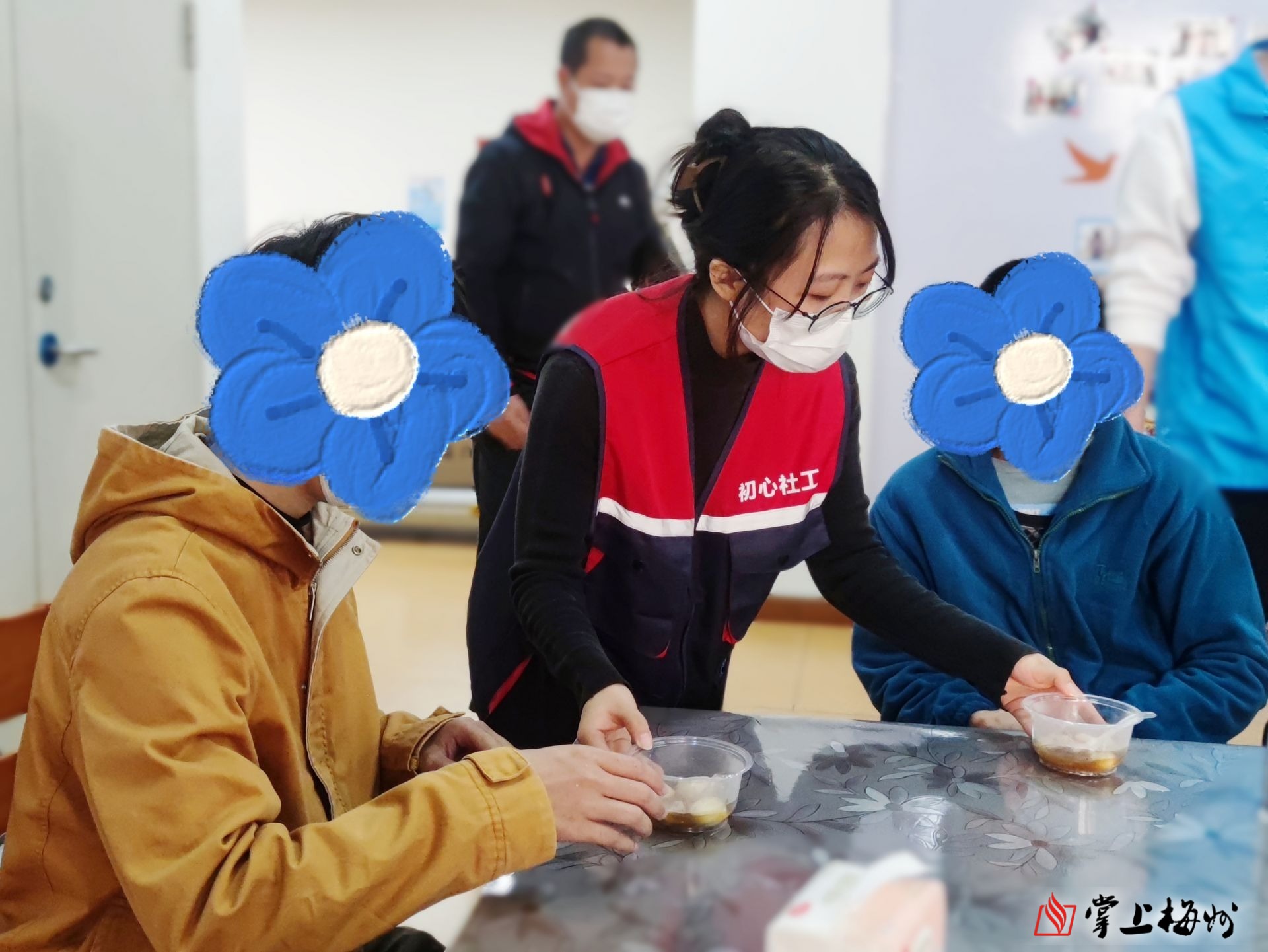 参与者们在社工的指导下,学习如何制作汤圆,并分组完成了和面、搓圆、包馅等步骤,参与者互帮互助、分工协作,整个活动弥漫着其乐融融的氛围,很快一堆圆圆滚滚、白白胖胖的汤圆就制作完成。接着,社工引导参与者进行“击鼓传花”游戏,放松身心,互动交流,共同度过了一个愉快的上午。当热气腾腾的汤圆出锅时,大家高兴地吃着自己的劳动成果,一边品尝着美食,一边分享着快乐。
