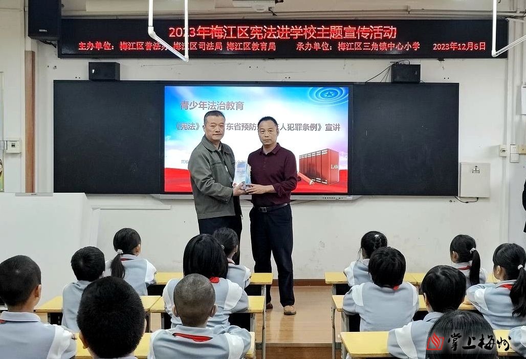 掌上梅州讯 12月6日,梅江区普法办、司法局、教育局联合在三角镇中心小学开展“宪法进校园 法治伴成长”普法宣传活动。