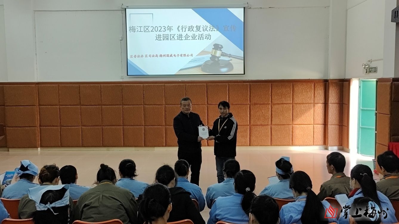 掌上梅州讯 12月22日,梅江区普法办、司法局到梅州国威电子有限公司开展《行政复议法》宣传进园区进企业活动。