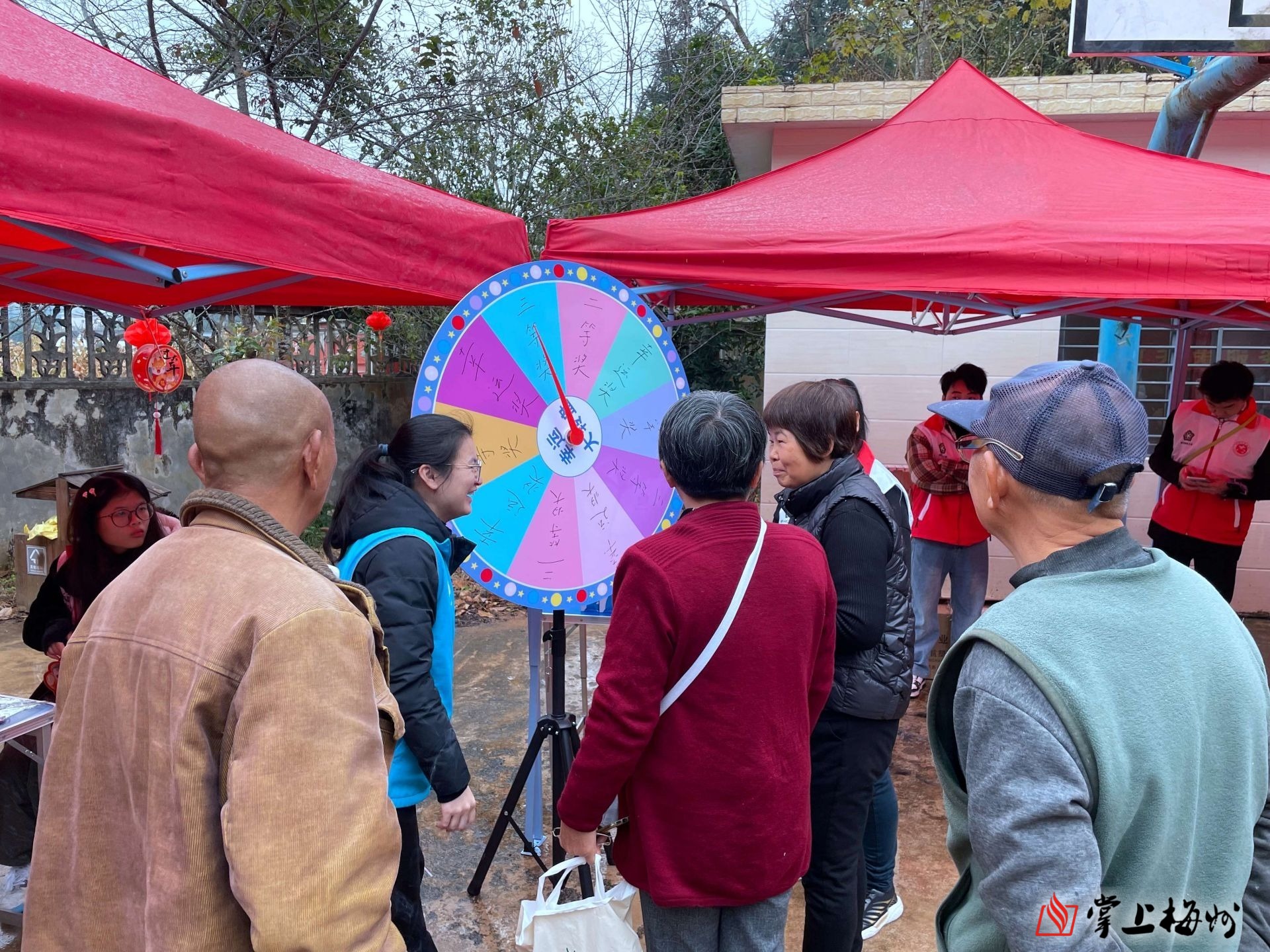 活动开始前虽下着小雨,但丝毫不影响群众们参加活动的热情,嘹亮欢快的音乐吸引大家早早地到达现场等候。活动在城北镇社工站副站长童丽明的主持下正式拉开序幕。现场既有玉水村广场舞队的舞蹈表演和合唱,又有社工服务宣传、爱心义剪、义诊,以及项目开展以来的成果展示;此外,还特别安排了互动环节,邀请到场的群众共同参与DIY手工艺品、趣味问答和大转盘抽奖、写春联等活动,现场活跃气氛热烈。