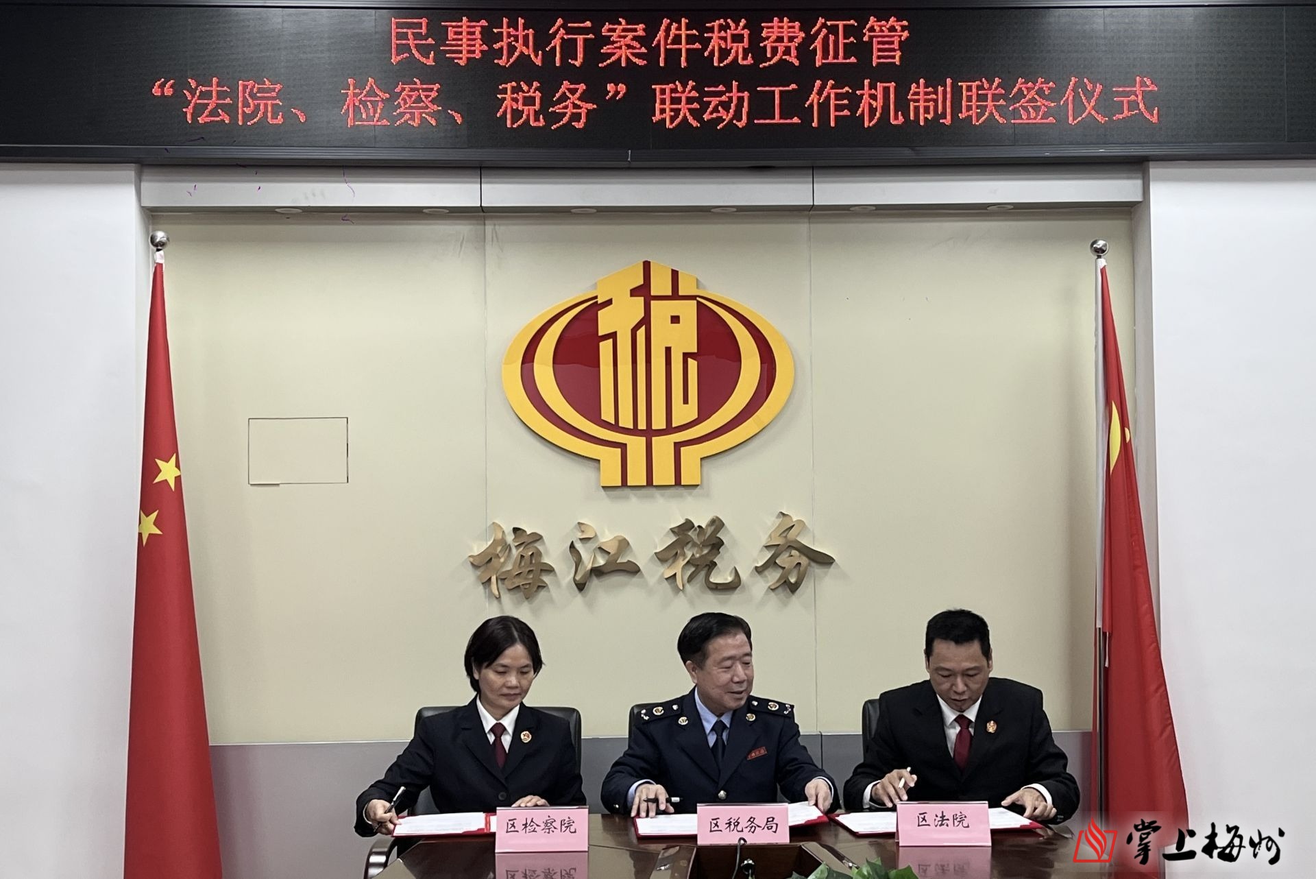 1月11日,国家税务总局梅州市梅江区税务局、梅江区人民法院、梅江区人民检察院三方联合签订了《民事执行案件利息、股息、红利所得税收征管协作机制(试行)》,标志着该机制即日起正式实行。