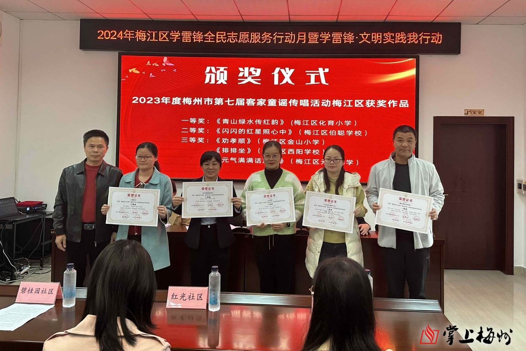 仪式上,传达学习贯彻习近平总书记对学雷锋志愿服务系列重要指示精神,并为该区2023年获评省、市学雷锋志愿服务先进典型代表、2023年度梅州市第七届客家童谣传唱活动获奖代表授荣。随后,青少年志愿者代表宣读“绿美广东 青年先行”植树护绿倡议书。广东省最美志愿服务社区梅江区金山街道碧桂园社区卢绮娴、广东省最美志愿者黄云光作学雷锋志愿服务项目展示交流宣讲。