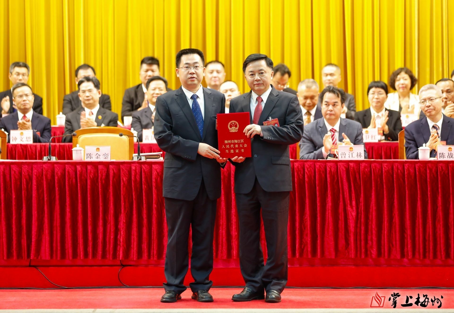 梅州市委副书记、梅江区委书记陈金銮为新当选的区人大常委会主任赖经烈颁发当选证书