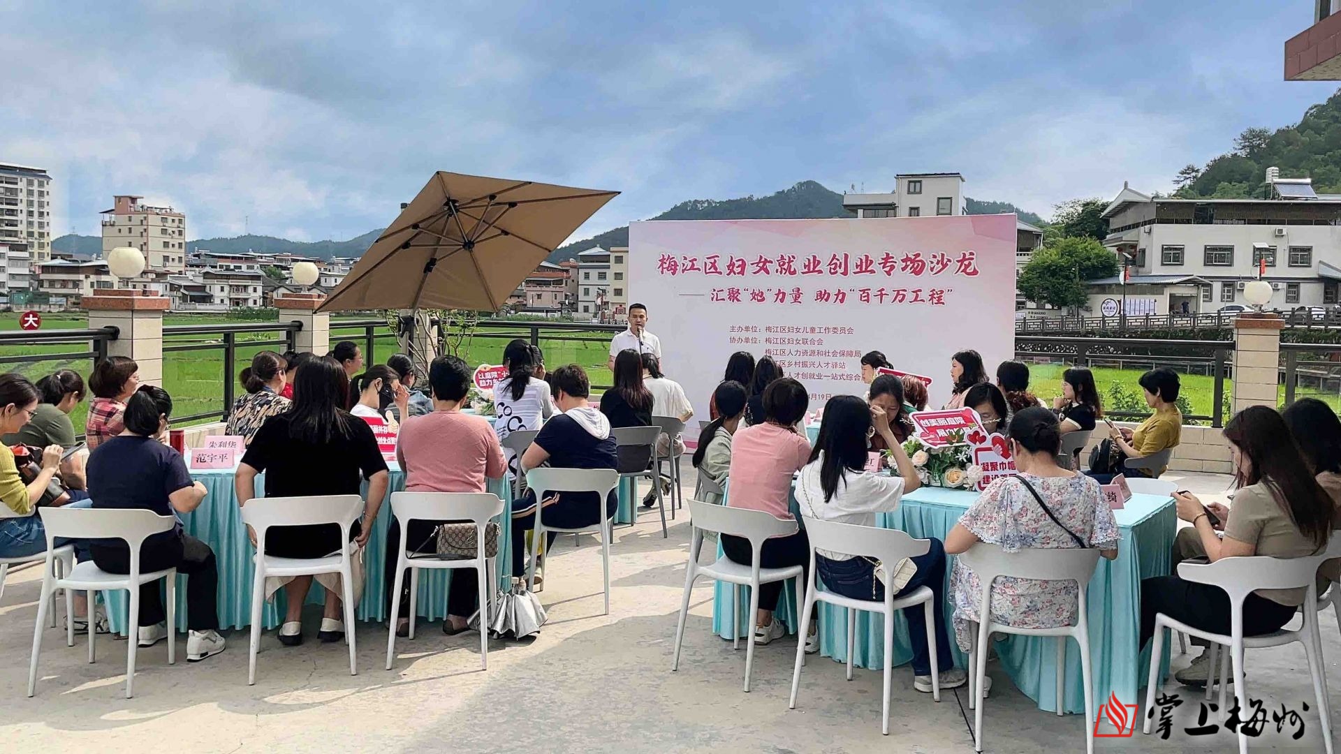 掌上梅州讯 4月19日上午,梅江区妇女就业创业专场沙龙活动在西阳镇阁公岭村“美丽庭院”示范户中举行。活动以“汇聚‘她’力量,助力‘百千万工程’”为主题,引导和激励广大妇女就业创业,为打造“美丽庭院”示范样板、助力梅江高质量发展贡献巾帼智慧和力量。梅江区妇女联合会、梅江区人力资源和社会保障局、各镇(街道)妇联主席,“百千万工程”典型村妇联主席及妇女代表、妇女创业代表共37人参加。