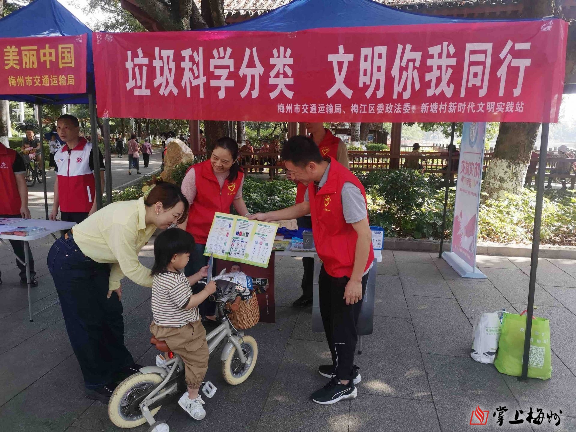 掌上梅州讯 5月17日上午,梅江区三角镇新塘村新时代文明实践站联合梅州市交通运输局、梅江区委政法委在剑英公园开展“垃圾科学分类,文明你我同行”宣传活动。