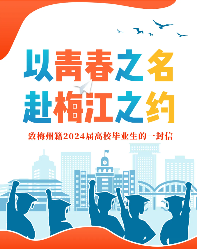 青春自有凌云志,一路奋进一路歌。自梅州启程的你,走过肆意灿烂的大学岁月,风华正茂、意气风发,有无数个可能的未来正向着你挥手。不管你身在何处,家乡始终牵挂着你的成长、期待着你的归来!在人生的新起点开启之际,“客都首府、活力梅江”向你发出诚挚邀约!