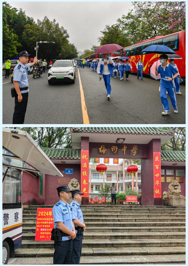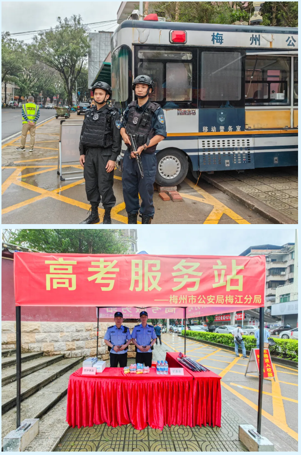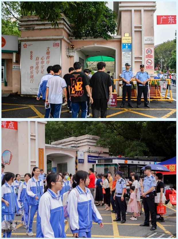 高考首日,梅江区在全区三个考点(东山中学、梅州中学、高级中学)共投入安保警力330人,以赶考姿态坚决做好护航高考的各项安保工作,提前谋划、周密部署,精心做好考场安保、考点周边治安整治、交通秩序维护、紧急办理临时身份证明、快速处理涉考报警求助等工作,全力保障高考顺利进行。