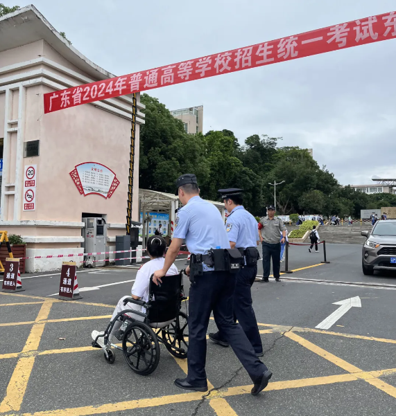 6月7日7时30分,一名坐着轮椅的考生来到东山中学校门口,考场执勤点负责人钟镜辉看到后立即上前询问情况。经了解,该考生前不久因交通事故导致脚部受伤,无法行走,只能坐着轮椅前来考试。