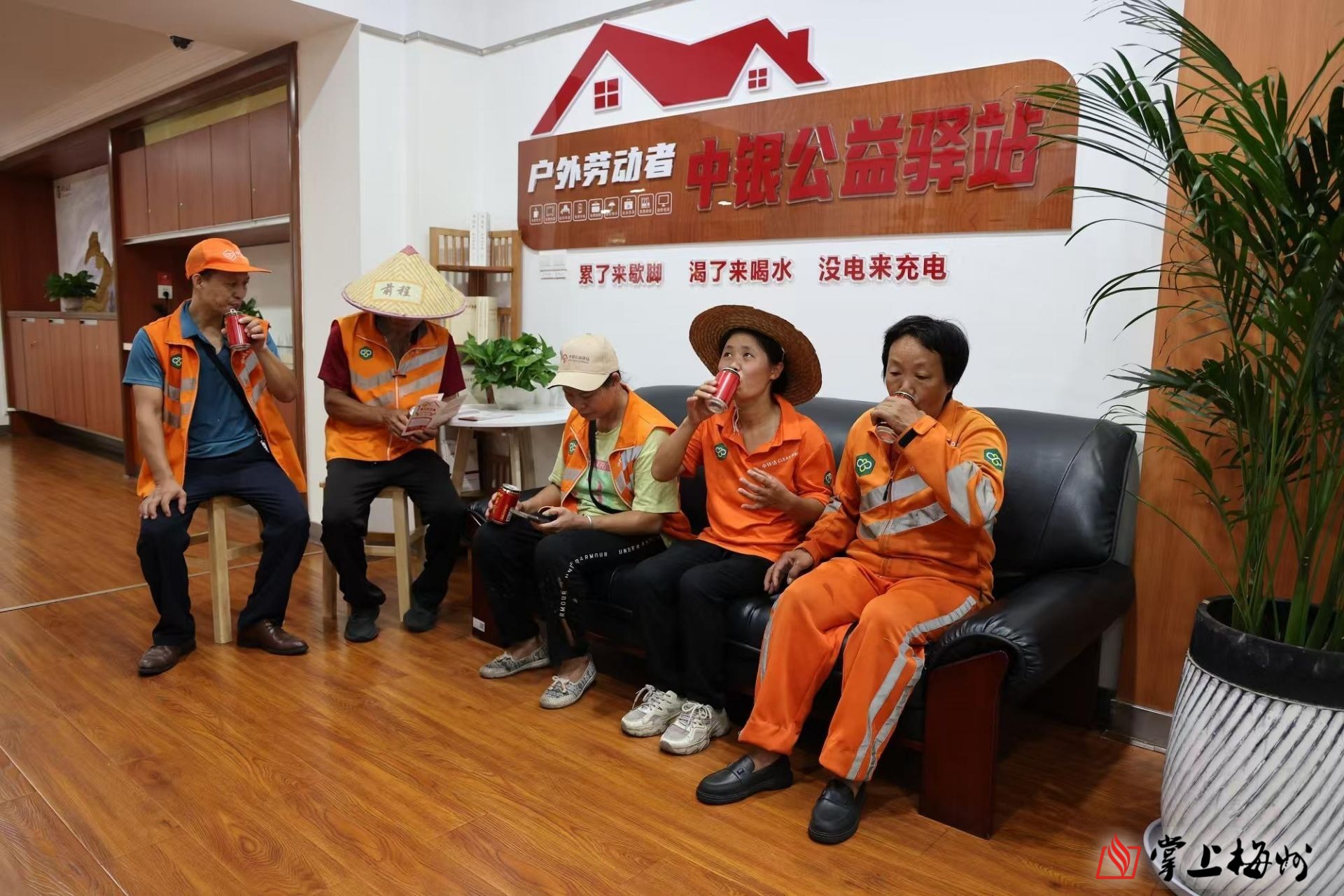 据了解,中银公益驿站(中国银行梅江支行工会驿站)位于梅城梅龙西路,是市民和户外劳动者落座歇脚的贴心场所。记者看到,驿站内环境整洁、便民设施一应俱全,陈列有清凉饮品、防暑用品等,可免费提供给市民和环卫工人、快递员、外卖配送员、城管人员、货车司机、网约车司机、媒体记者等各行各业户外劳动者使用。