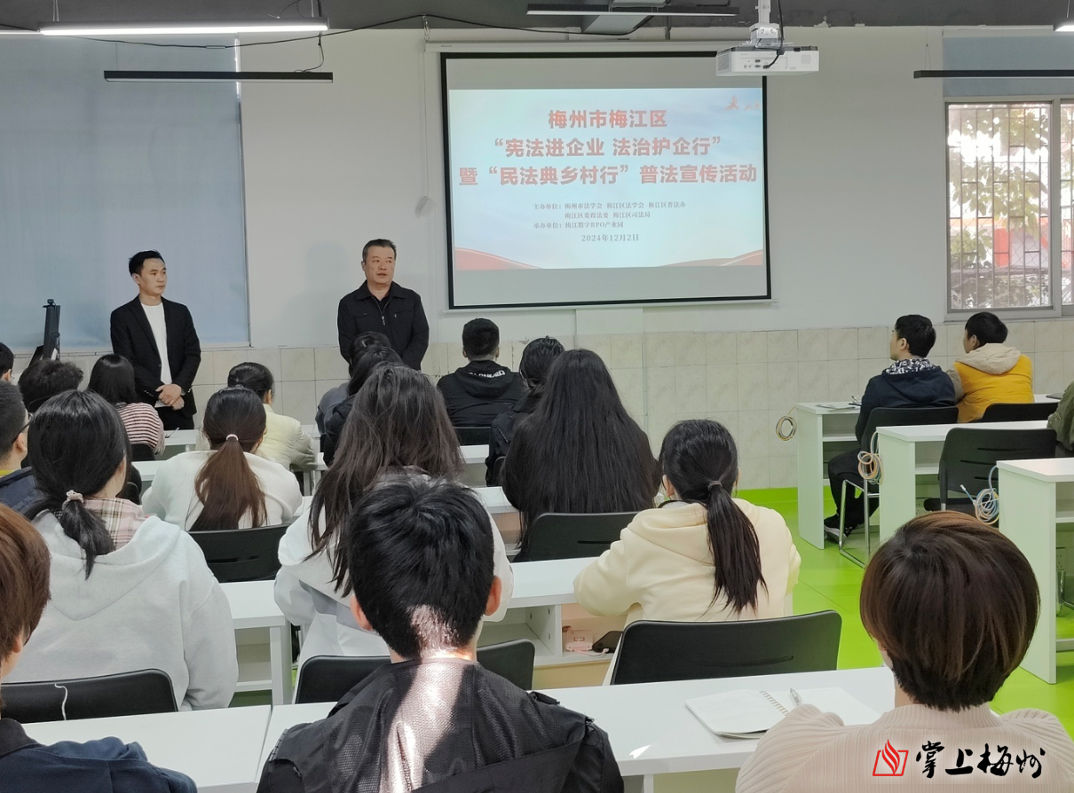 掌上梅州讯 日前,梅江区委政法委、梅江区普法办、梅江区司法局、梅州市法学会、梅江区法学会联合到梅江数字BPO产业园开展以“宪法进企业 法治护企行”暨“民法典乡村行”普法宣传活动。