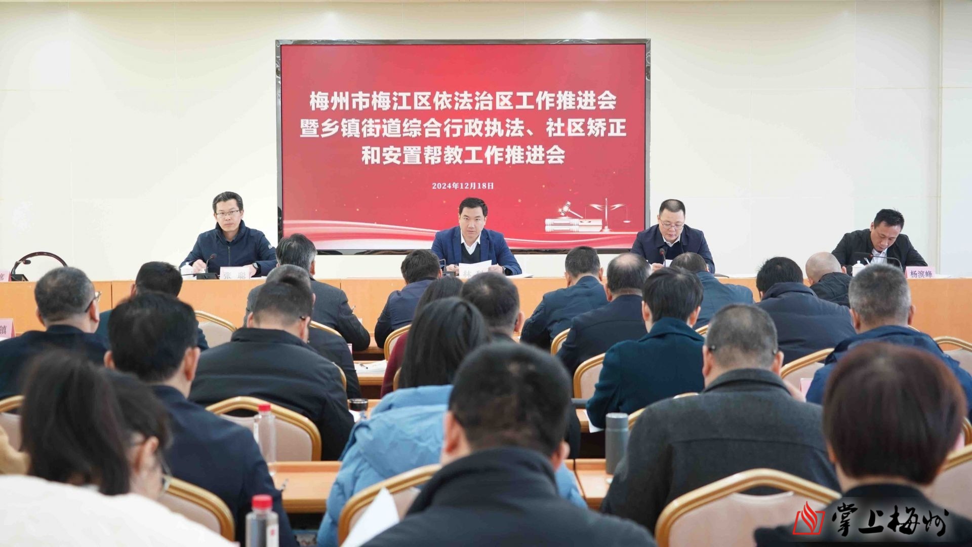 掌上梅州讯 12月18日,梅江区召开依法治区工作推进会暨乡镇街道综合行政执法、社区矫正以及安置帮教工作推进会。梅江区委常委、政法委书记林科出席会议并讲话。市公安局副局长、梅江区政府副区长、市公安局梅江分局局长郑荣丰主持会议。