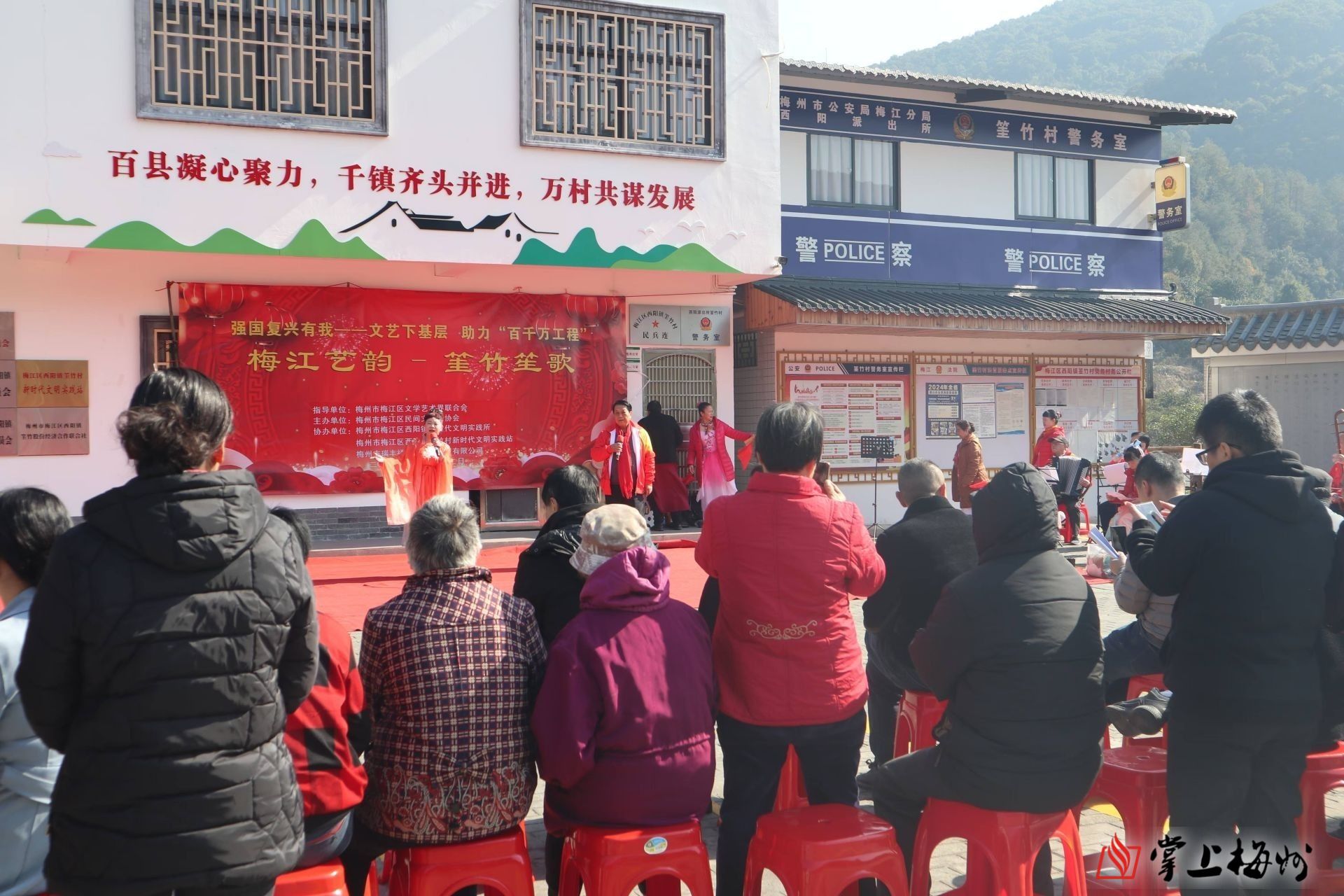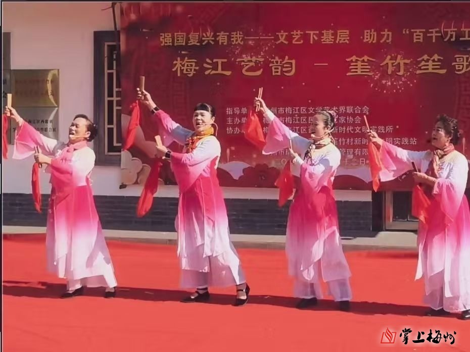 在此次采风活动的《梅江艺韵——筀竹笙歌》文艺交流演出中,山歌对唱《我家住在筀竹村》、口琴独奏《英雄赞歌》、快板《明珠耀梅江》以及五句板《美丽家园幸福长》等精彩节目轮番上演,悠扬的曲调与质朴的歌词吸引了众多村民及游客驻足观看。这些节目不仅展现了当地浓郁的文化底蕴和民俗风情,还生动地展示了筀竹村崭新的风貌,让更多人感受到了筀竹村的独特魅力与蓬勃发展的活力。