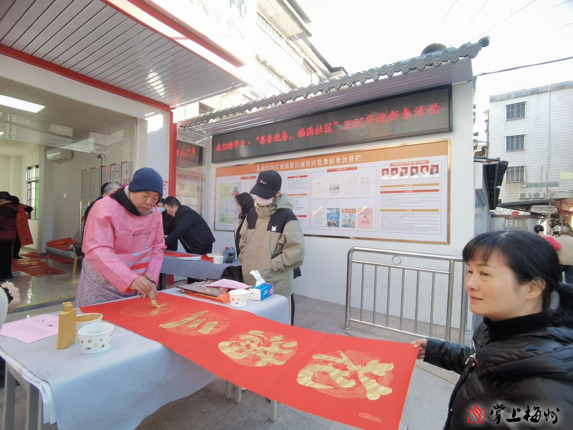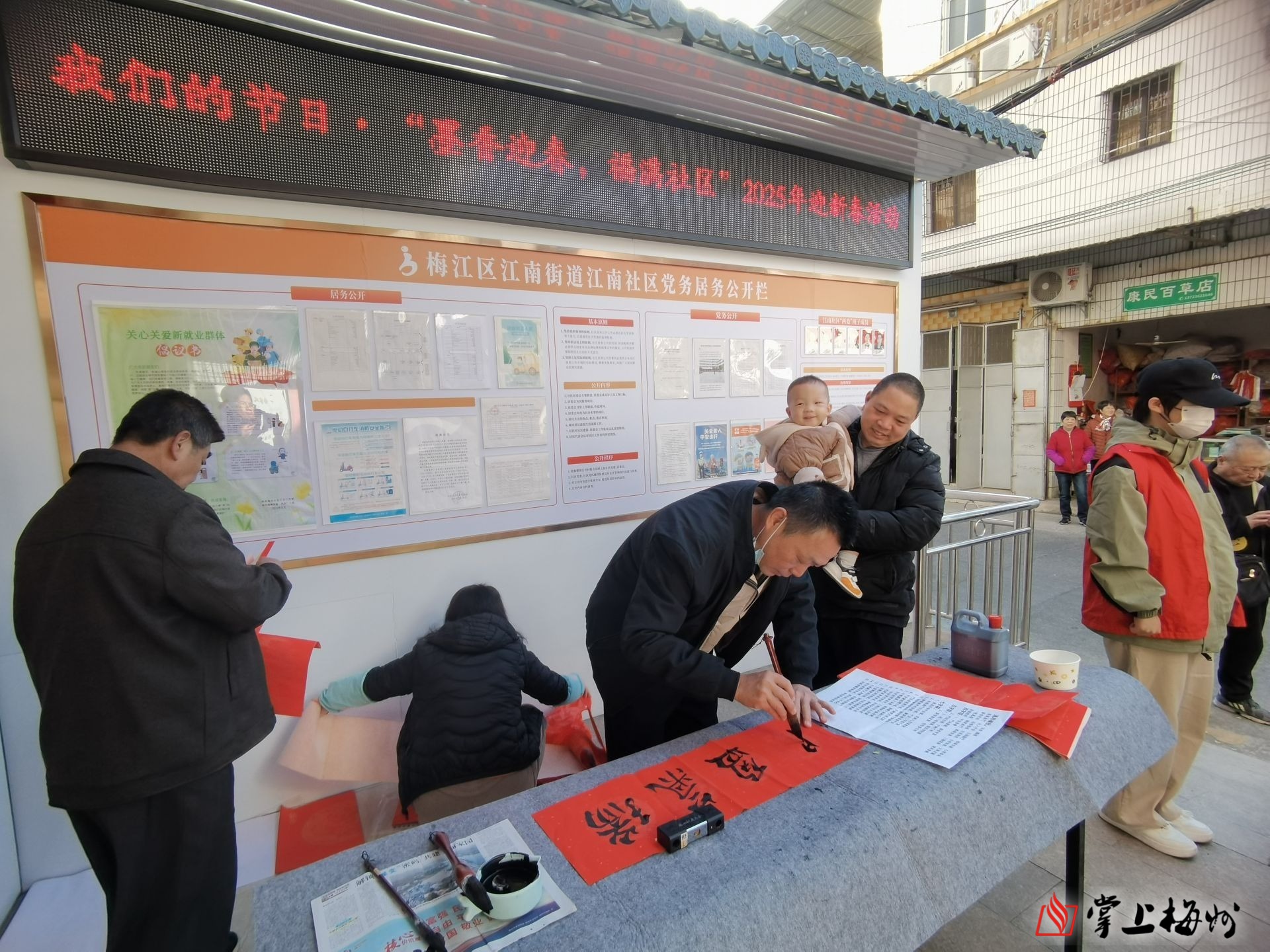 掌上梅州讯 1月13日上午,梅江区江南街道江南社区党群服务中心一楼热闹非凡,一场以“墨香迎春,福满社区”为主题的2025年迎新春活动在此欢乐开展。此次活动旨在传承中华优秀传统文化,丰富居民业余生活,营造节日氛围,增进邻里感情。