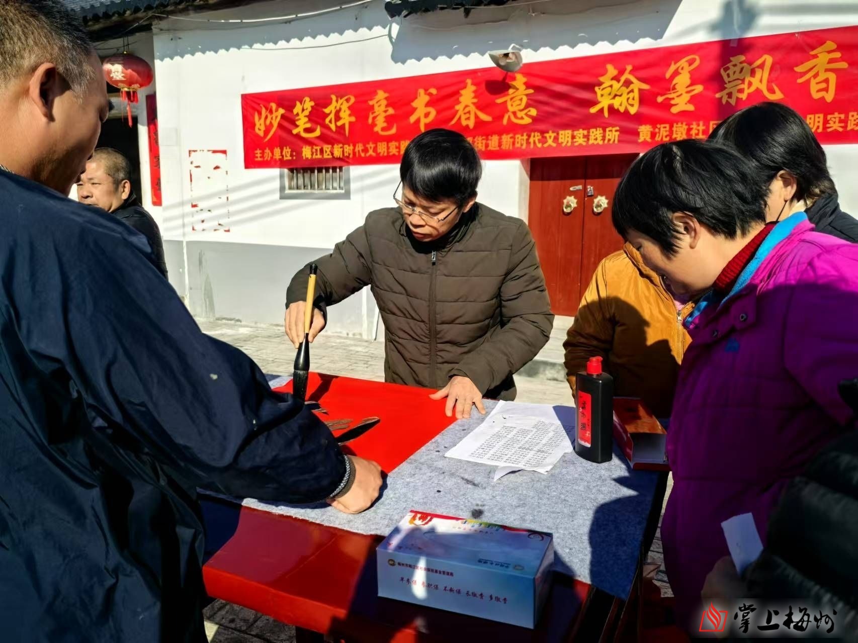 1月13日上午,梅江区新时代文明实践中心、黄泥墩社区新时代文明实践站及梅江区书法家协会联合开展“妙笔挥毫书春意,翰墨飘香迎新春”活动。次日下午,西郊街道新时代文明实践所开展“翰墨飘香迎新春”活动。在这两场充满文化气息的活动中,书法名家们齐聚一堂,挥毫泼墨,用手中的毛笔为辖区居民书写春联、绘制 “福”字,传递新春的美好祝福。