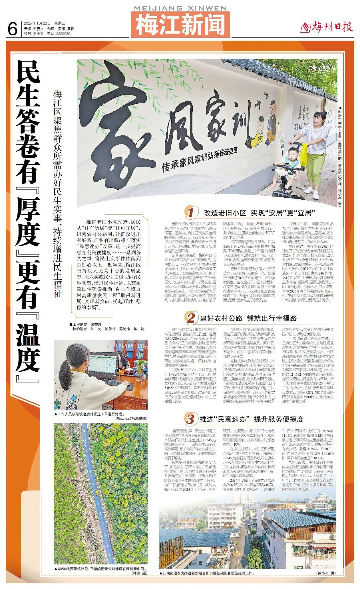 推进老旧小区改造,居民从“住有所居”变“住可宜居”;织密农村公路网,让群众进出有好路、产业有出路;推广落实“民意速办”改革,进一步提高惠企利民便捷度……一系列务实之举,将民生实事件件落到百姓心坎上。近年来,梅江区坚持以人民为中心的发展思想,深入实施民生工程、办好民生实事,增进民生福祉,以高质量民生建设推动“百县千镇万村高质量发展工程”取得新进展、实现新突破,托起百姓“稳稳的幸福”。