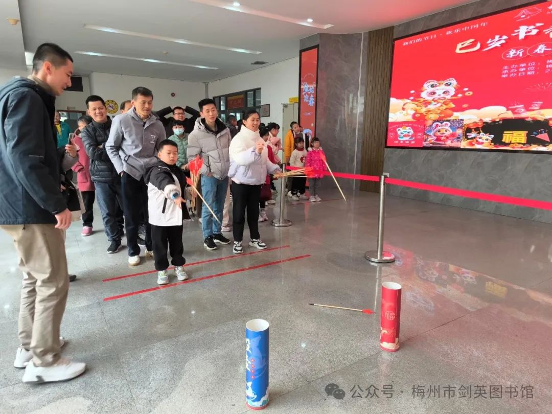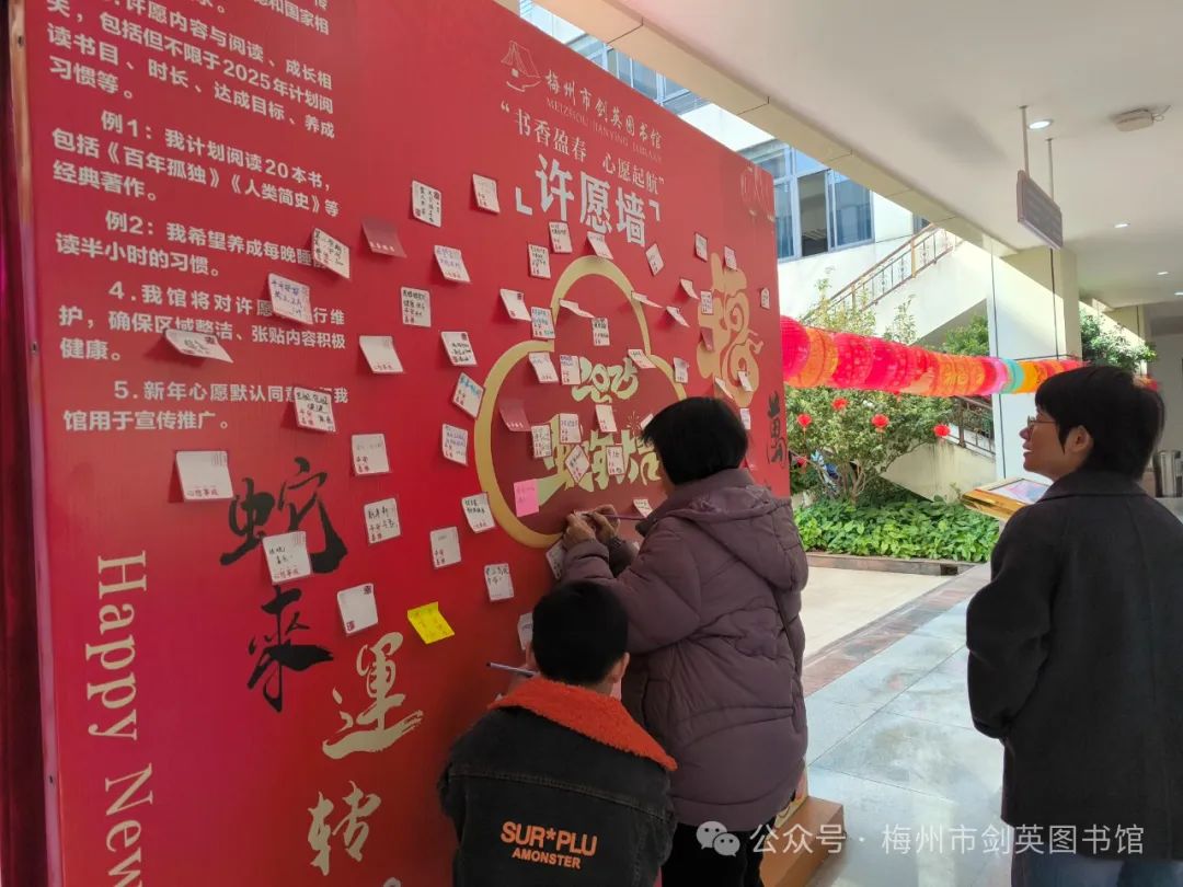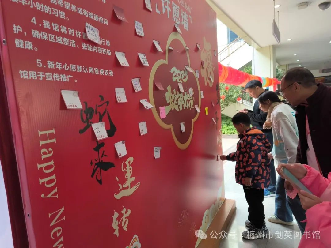 灵蛇献瑞,书香迎春。1月29日(正月初一),“巳岁书香 灵蛇迎春”新春游园活动、“书香盈春 心愿启航”新年许愿墙打卡活动、“阅无限·向未来”阅读达人成长计划、“寻年味、享年趣、阅新年”新春图书推荐、“激活经典 熔古铸今”——《中华传统文化百部经典》出版成果展、画游千年——《写给儿童的世界历史》插画展等一系列活动在梅州市剑英图书馆热闹举行,吸引读者约500人次热情参与。