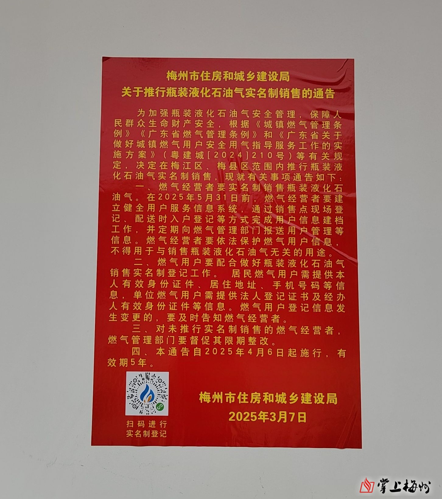 今年3月份,市住房城乡建设局发布《关于推行瓶装液化石油气实名制销售的通告》(以下简称“《通告》”),决定在梅江区、梅县区范围内推行瓶装液化石油气实名制销售。4月6日起,《通告》正式施行,一方面燃气经营者要实名制销售瓶装液化石油气,另一方面燃气用户要配合做好瓶装液化石油气销售实名制登记工作,进一步加强瓶装液化石油气安全管理,保障人民群众生命财产安全。