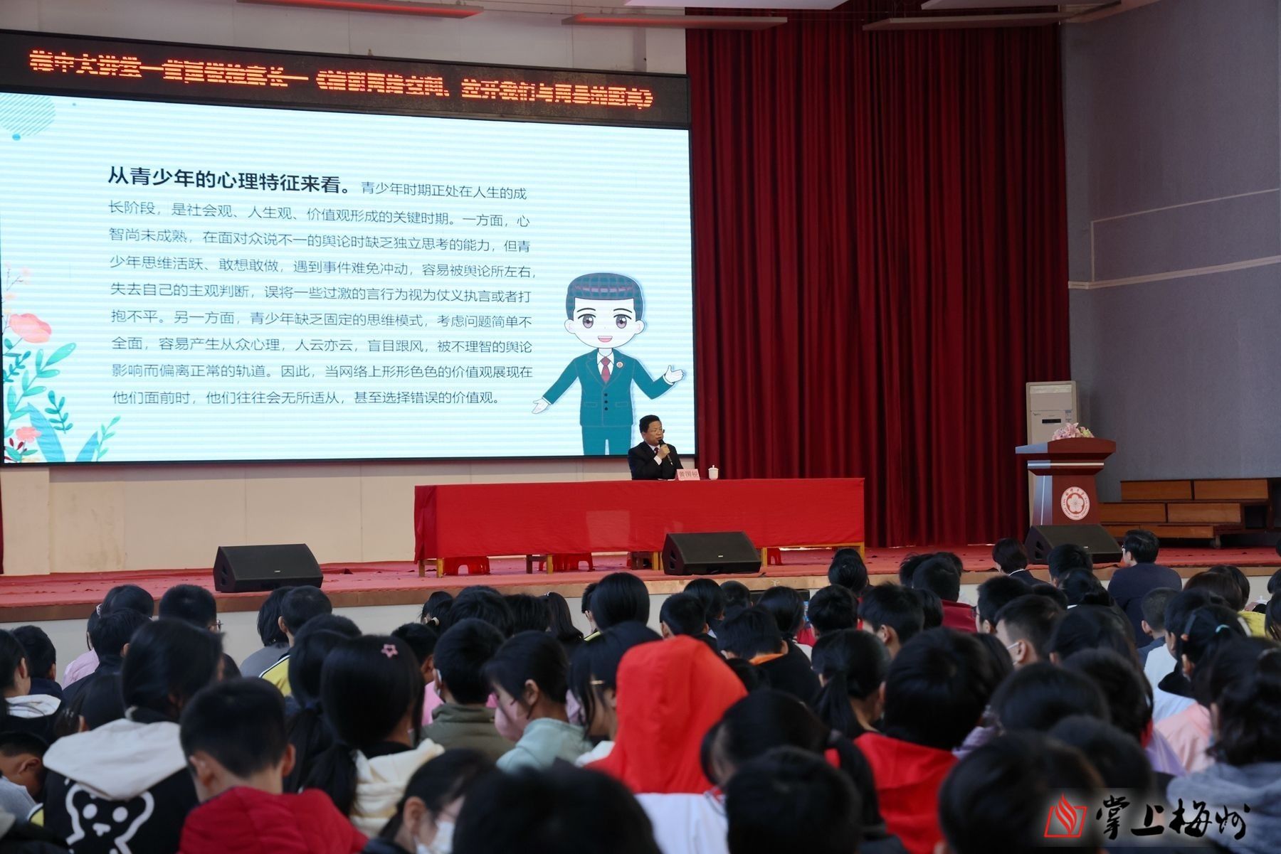 今年春季开学时,梅江区检察院联合相关职能部门开展“围龙护未”普法宣传活动。检察官结合学生的年龄特点和认知水平,解读未成年人保护法和预防未成年人犯罪法等,引导学生增强法治意识,学会运用法律武器维护自己的合法权益。