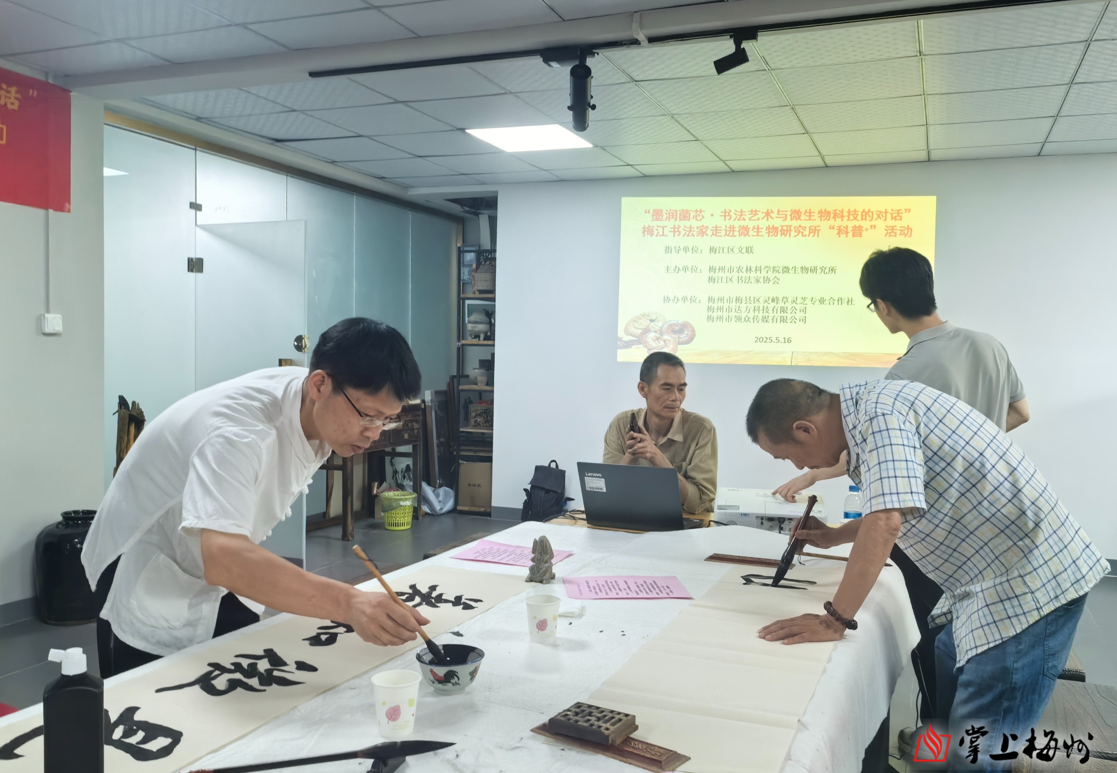活动由梅江区文联指导,梅州市农林科学院微生物研究所、梅江区书法家协会联合主办,10多位书法家、多位微生物科研专家参加。