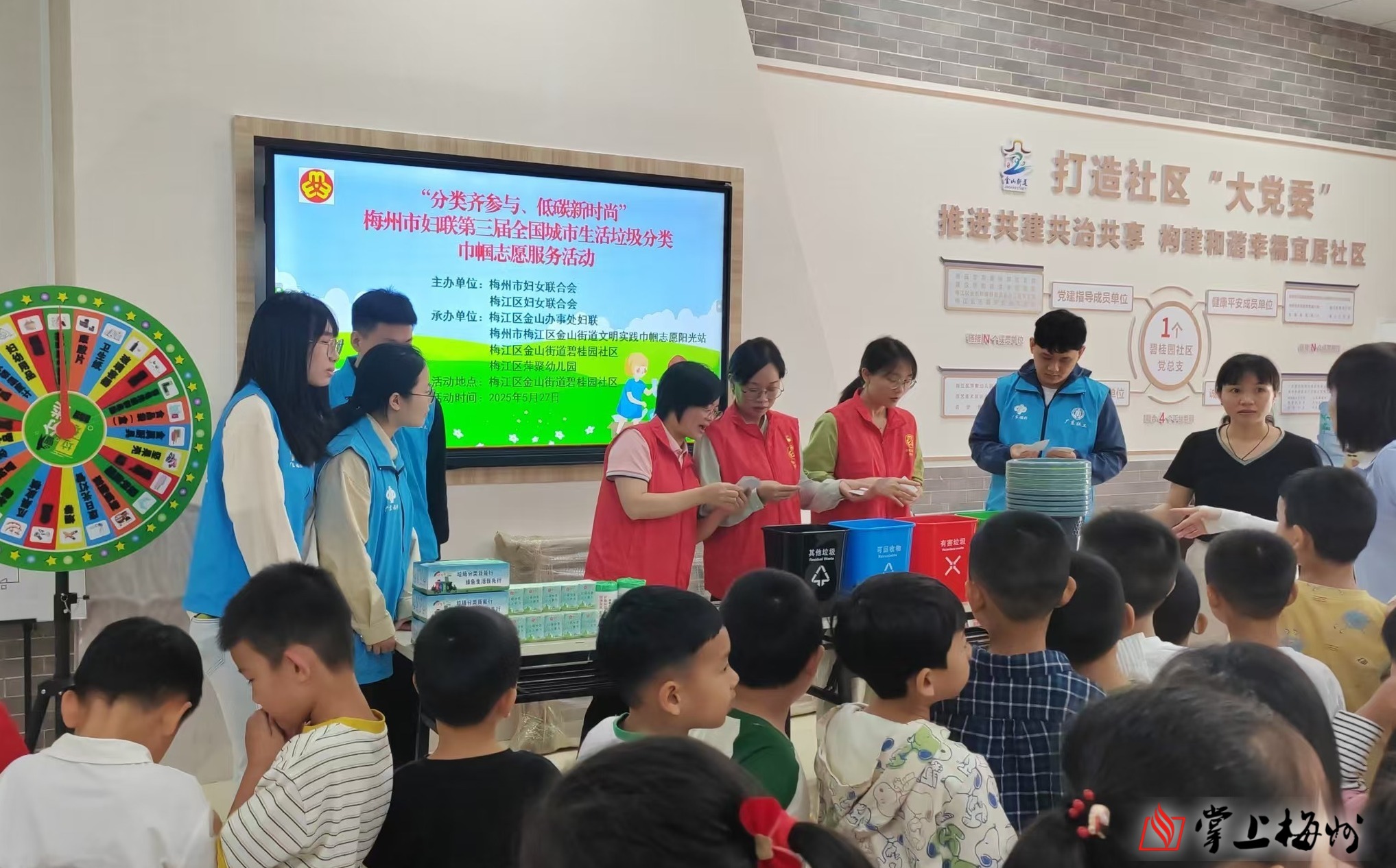 5月27日,金山街道妇联、金山街道文明实践巾帼志愿阳光站、金山街道新时代文明实践所联合梅州市妇女联合会、梅江区妇女联合会、碧桂园社区及萍聚幼儿园在碧桂园社区,举办第三届全国城市生活垃圾分类巾帼志愿服务活动。活动充分发挥妇女群体和家庭在生态文明建设中的示范作用,通过多样化形式普及分类知识。现场开设垃圾分类小讲堂,以趣味问答和情景模拟帮助小朋友们掌握分类技巧。